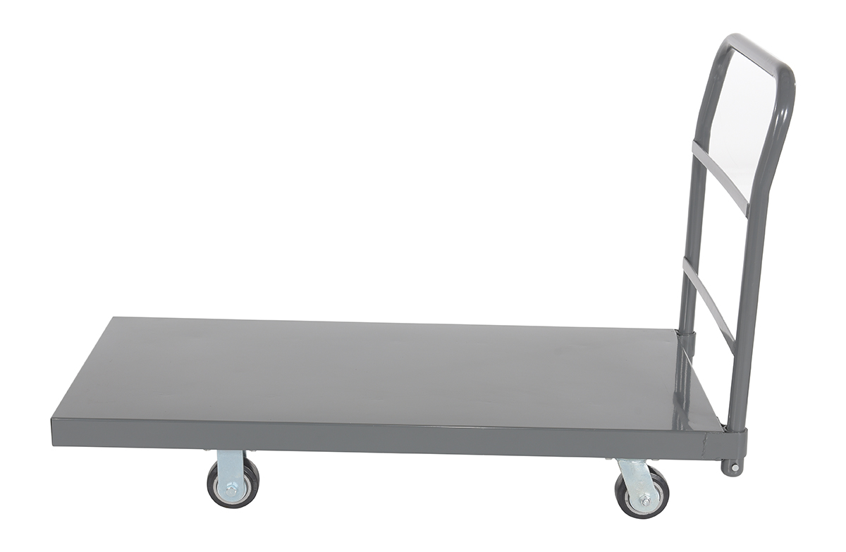 Steel Smooth Deck Platform Truck with 4 In. x 2 In. Mold On Rubber Casters 2000 Lb. Capacity GrayThis steel platform truck with a solid, smooth steel deck is all welded and features structural reinforcement underneath for extra strength. Includes one (1) removable high-polished steel handle and rolls smoothly casters. Comes standard with a floor lock.