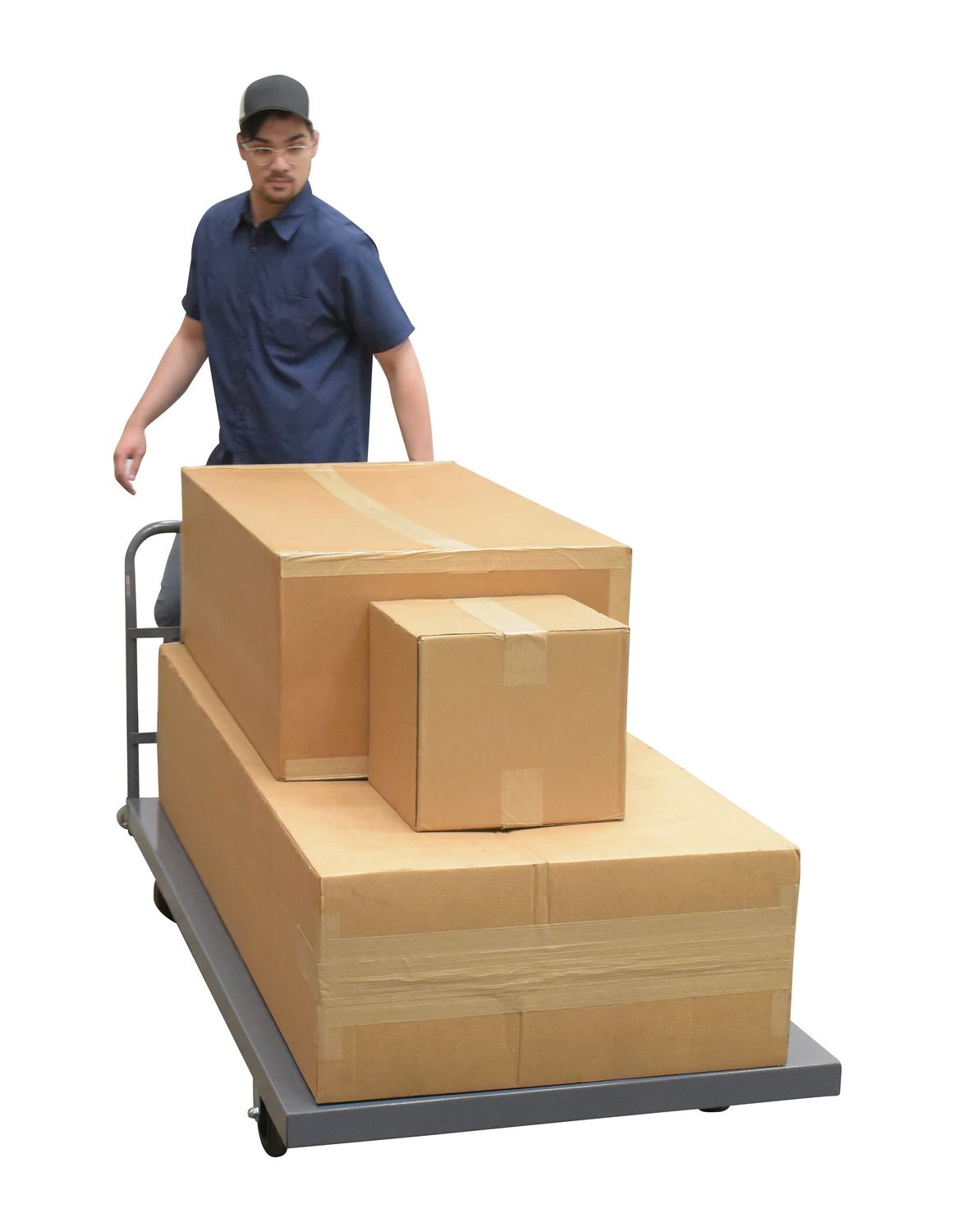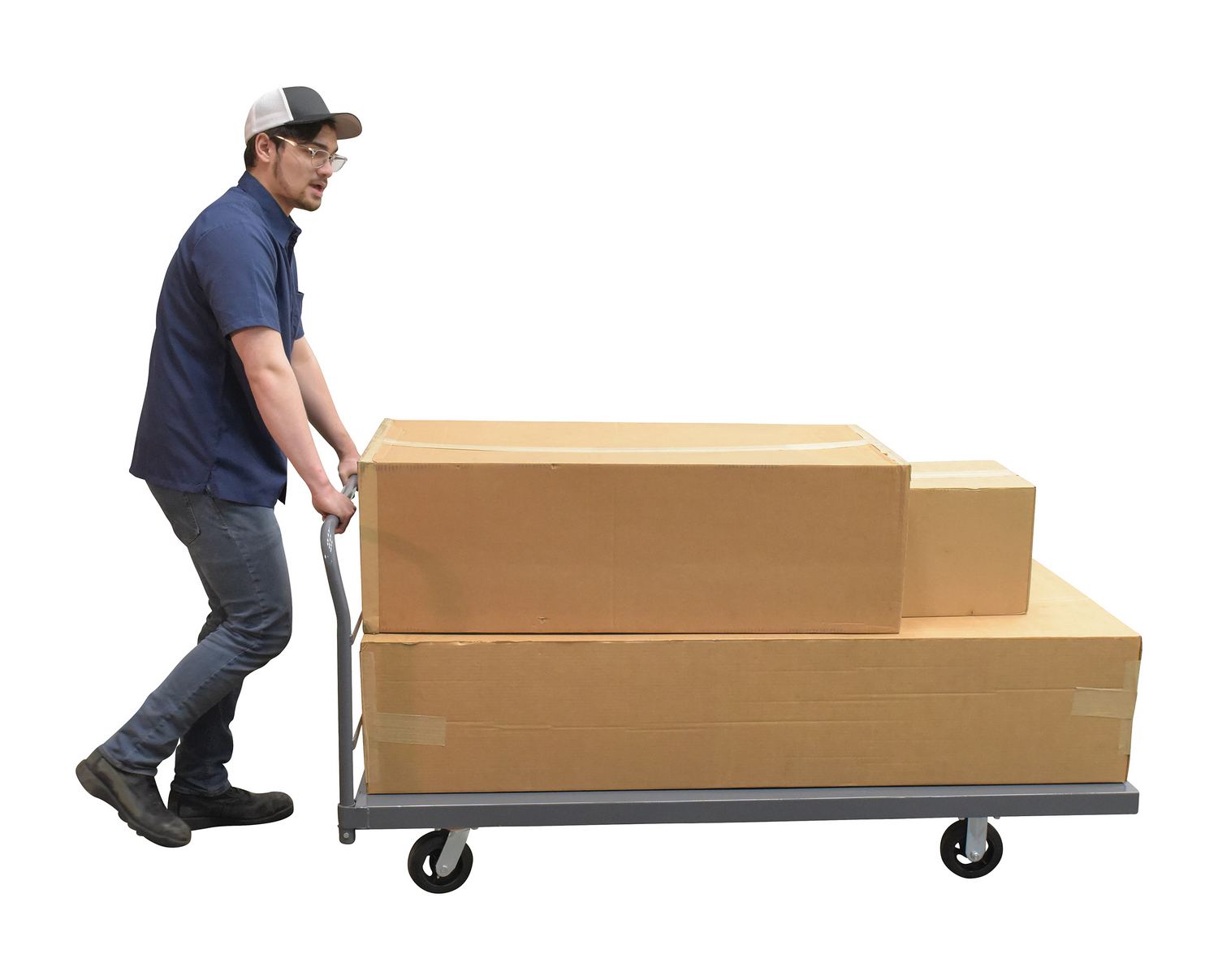 A steel platform truck is the perfect addition to any warehouse or shipping center. The steel platform design provides the user with a better sense of security. With a smooth surface, the amount of abrasion and scuffs during movement is limited. The steel handle allows the user to maintain an ergonomic posture while transferring goods. Mold on rubber casters roll smoothly. Powder coated finish provides added toughness.