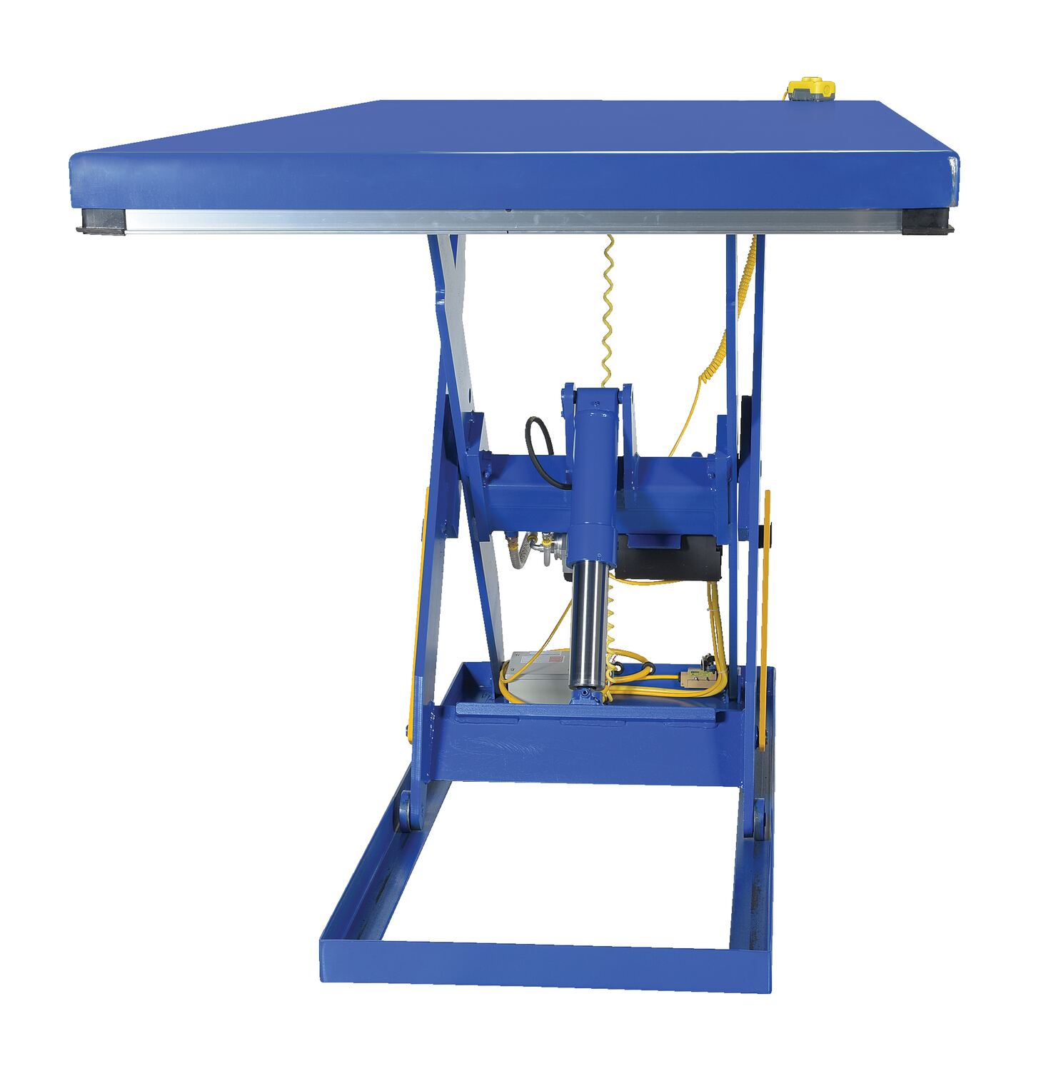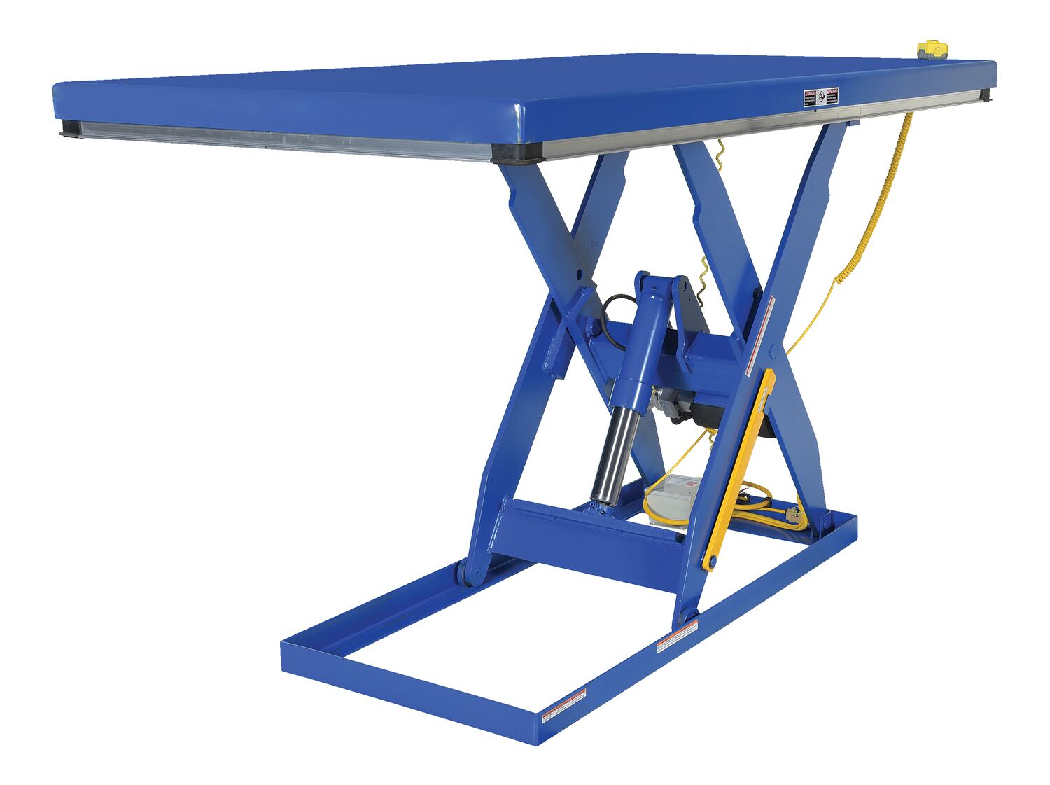 The electric hydraulic scissor lift table is used by all types of manufacturing and warehouse facilities. Safety features include a patented pinch point perimeter toe guard to protect pinch points while lowering the table, fused push button control, internal safety velocity fuse to maintain platform height in the event of hose or fitting failure, integral maintenance prop, adjustable upper travel limit switch to stop the table at maximum height, and displacement-style hydraulic cylinders for maximum strength. It also features a pressure plated pump, manifold system, and state-of-the-art lifetime lubricated bearings. The standard 56 frame electric motor is fully enclosed with additional voltage options available. Contact factory if platform dimensions are crucial.
