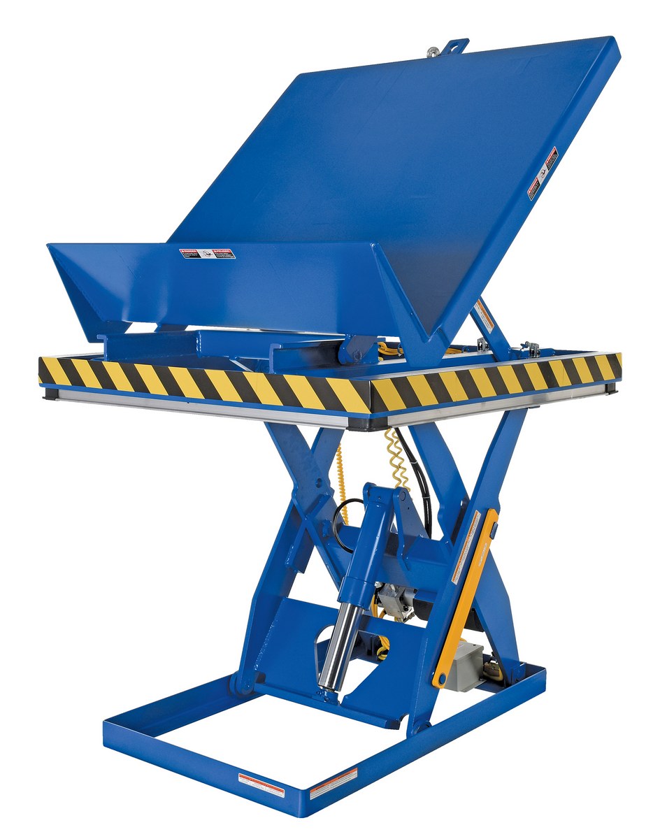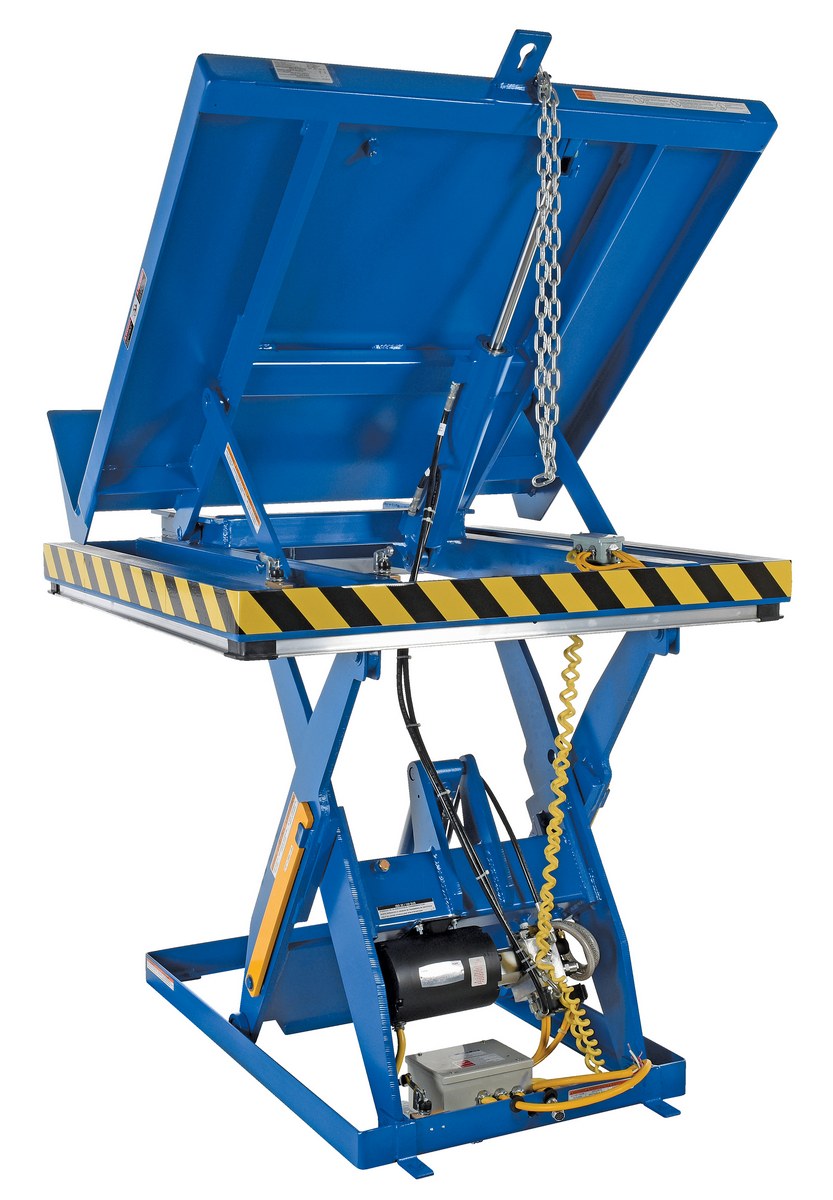 Steel Lift and End Tilt Scissor Table 48 In. x 48 In. 3000 Lb. Capacity BlueThe lift and tilt scissor lift performs both lifting and tilting operations. There is a restraining chain and lip to keep the load in place during tilting. Safety features include an electric toe guard to protect workers from pinch points during lowering of the table, velocity fuses to hold platform position in the event of a hose or fitting failure, four (4) push-button hand pendent control, upper limit switch to stop travel at maximum height and reduce motor wear, and maintenance prop. The end tilt is standard with a side tilt available. There is optional accordion skirting available for both the lifting and tilting portions of the table.