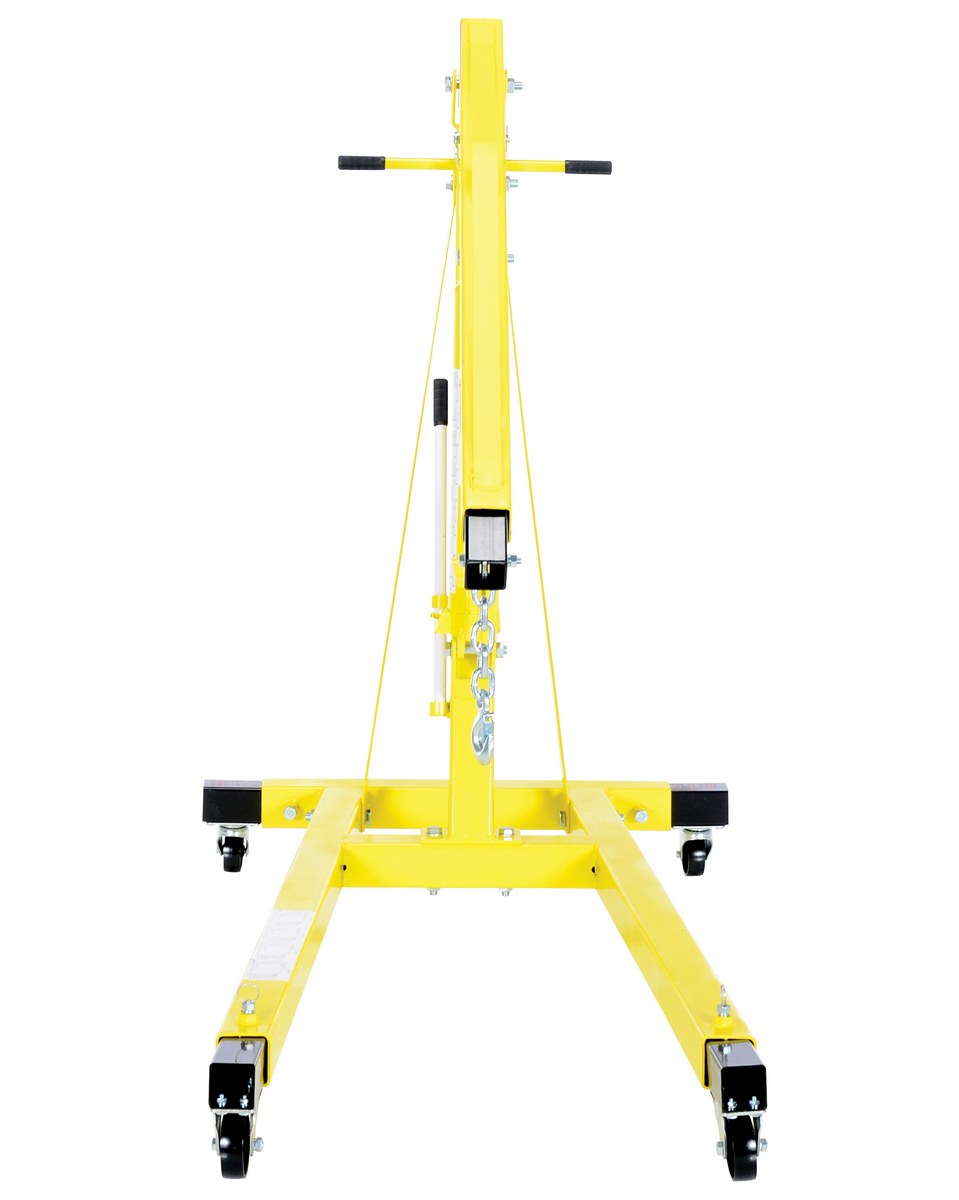 A portable shop crane engine hoist is great for hundreds of lifting applications. It features a telescopic boom, benefiting different lifting heights and capacities. Features a large diameter ram to withstand angled loads when lifting. Includes two (2) rigid and two (2) swivel casters for portability. Heavy-duty steel construction and painted finish.