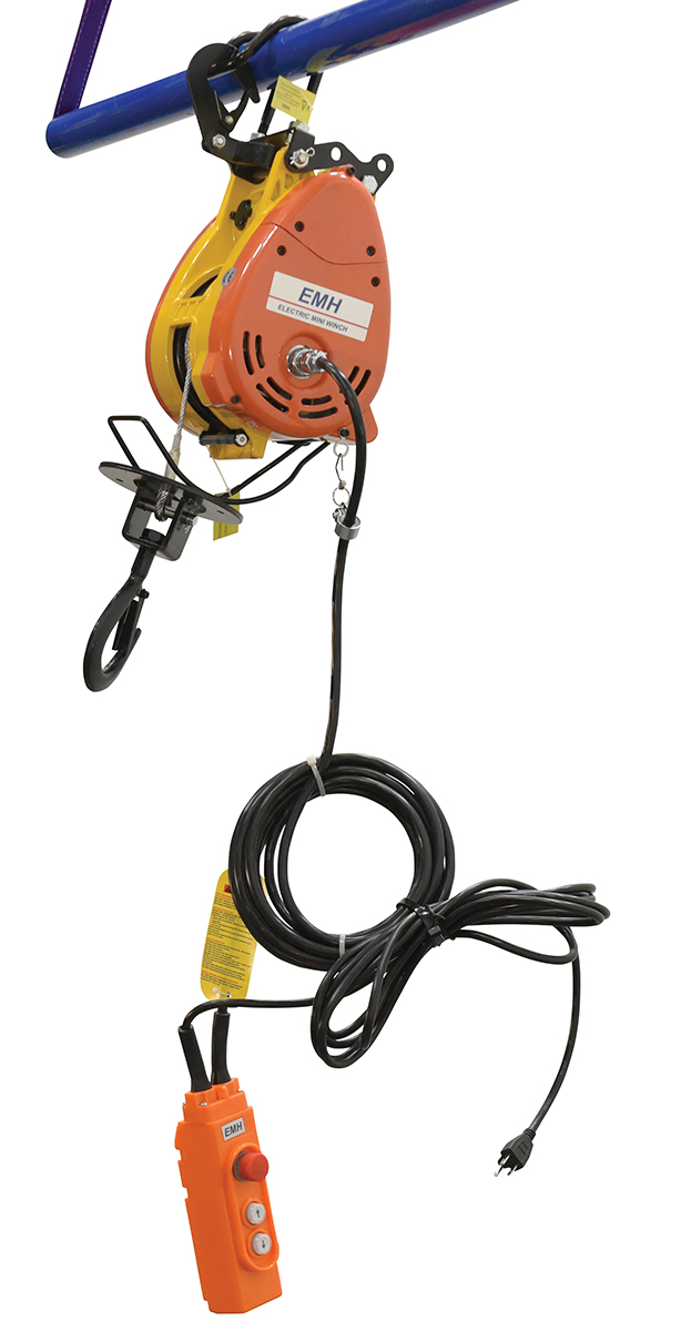 A lightweight and compact design ideal for a wide range of applications, including construction sites, rigging, warehouse, storage area, confined spaces and plumbing. It easily mounts to most scaffolding and beams, secured with latch hook. Robust design, strong steel construction and durable powder coated finish. Safety features include a dual braking system to provide instant and safe braking, a built in raise/lower limit switch to prevent excessive winding a 360 degree swivel hook with safety latch, a thermal overload on the motor, and a quick disconnect power and hand control cord. The unit also features low noise and smooth operation.