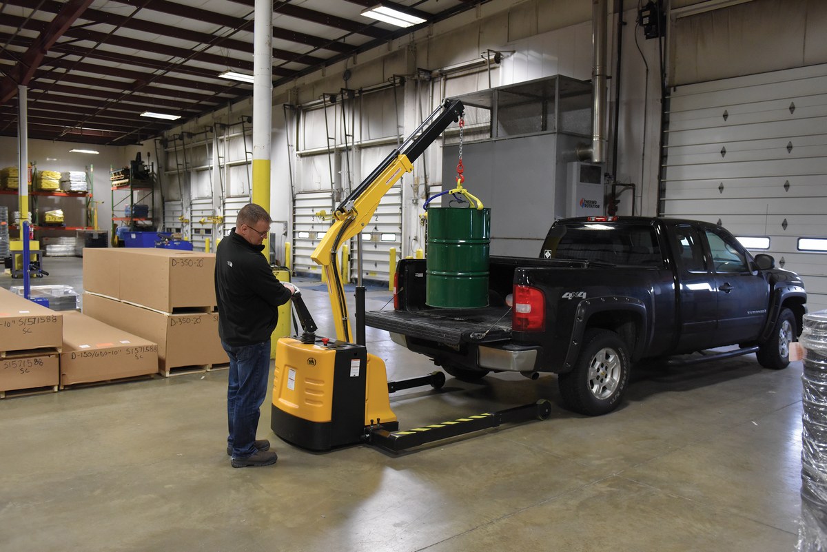 The fully powered electric floor crane has an easy and quick operation. The unit raises and lowers loads with a push of a button. It can maneuver loads in warehouses and trailers. The heavy duty rigid hook with safety latch provides long service. The high-torque DC drive and lift motors handle heavy-duty jobs. Floor crane includes integral battery charger, battery level gauge, and emergency battery disconnect. The truck rolls smoothly on poly-on-steel, steer and load wheels. The ergonomic handle features an easy to operate throttle with infinite adjustment of forward and reverse speeds, controlled lift/lower controls, adjustable length legs, proprietary safety-enhancing emergency reverse function, and horn. When the proprietary safety-enhancing emergency reverse function is activated, the emergency reverse belly switch instantly reverses direction and moves the unit forward (away from the operator) until the switch is released or after 1.5 seconds have elapsed. The built-in safety circuit will automatically disable the entire unit if the emergency reverse belly switch is activated for more than 1.5 seconds after which the unit must be re-set to return to normal operating conditions. This state-of-the-art safety device provides a level of operator protection which is unmatched by any unit on the market today. The unit also includes an electromagnetic disc brake with automatic dead-man feature that activates when the user releases the handle. Not recommended for use on inclined surfaces and no greater than 4 degrees on a declined surface.