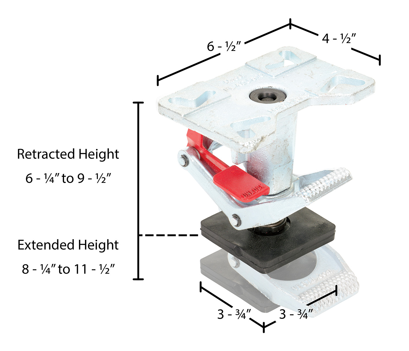 Used with Caster Size (in. - in.): 6 to 8 Extended Height (in. to in.): 8-1/4 to 11-1/2 Retracted Height (in. to in.): 6-1/4 to 9-1/2