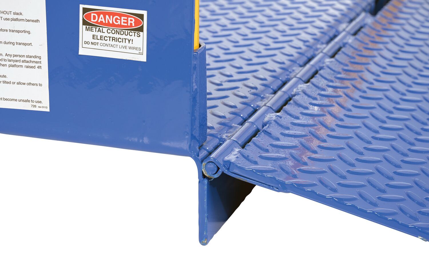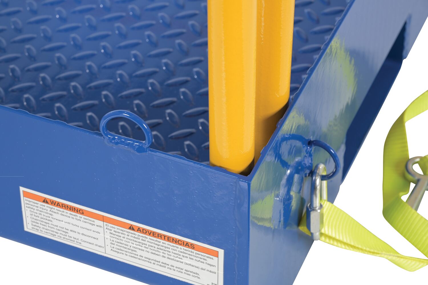 Steel Economical Portable Loading Platform with Handrails 54 In. x 54 In. 2000 Lb. Capacity BlueThis loading platform for fork trucks allows fork trucks to load/unload items into trucks and trailers. Maximum uniform weight capacity is dependent on fork truck capacity. Includes fold-down lip to help with transition. Side guard toe boards. Four (4) tie-down rings are included for securing equipment (tie downs not included). Diamond tread plate floor for extra traction. Handrails on two (2) sides, back mesh screen and chain to secure open end. safety strap (included) to secure platform to fork truck. Steel construction with blue baked-in powder-coated toughness.