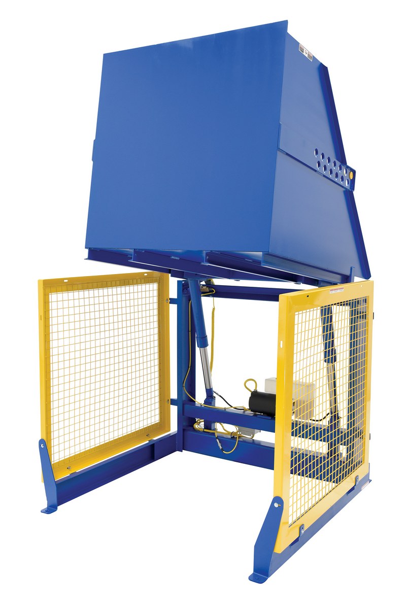 The electric/Hydraulic box dumper is designed for controlled dumping of material from boxes, crates, and other types of containers. It is designed for pallet truck loading and unloading. The retaining bar adjusts to accommodate a wide range of container heights. Each dump height has a hold down range and an internal power unit with a hand held control standard. It has a heavy-duty welded steel construction with protective mesh side screens included.