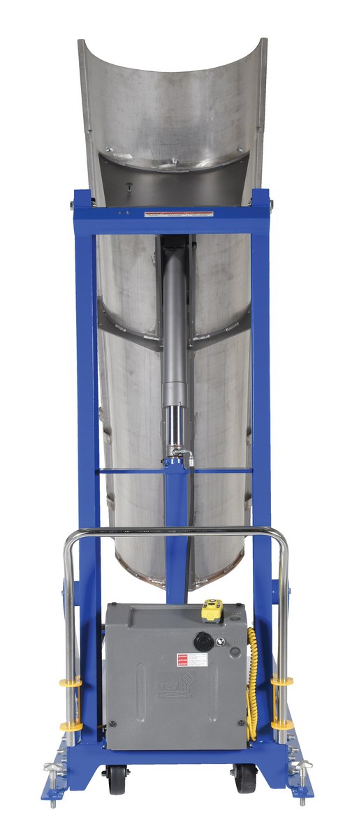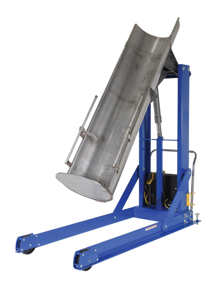 The Hydraulic drum dumper is what you need to dump heavy drums. Works with plastic, steel, and fiber drums. Dumper has a solid steel chute. this portable unit has casters with floor lock screws. All steel construction. Upper travel limit switch, emergency brass safety velocity fuse in cylinder, and vertical adjustment drum restraints are standard. Dumper is operated with a hand held control on a coil cord standard.