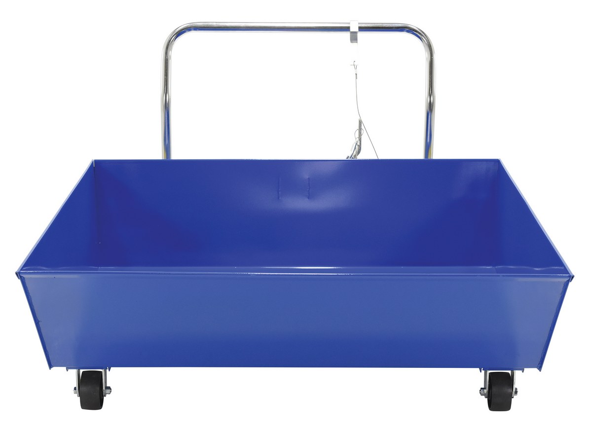This unique Low Profile parts Hopper has been designed to function as a parts hopper that may be dumped with the assistance of a fork truck. The low profile design allows the hopper to be placed underneath machinery as a catch basin for parts. The newly designed hopper reduces the hazards, inconveniences, and time associated with collecting parts off the floor. Unit rolls smoothly on casters and includes a removable push handle. Once the material is dumped, the hopper will return to the locked position when lowered to the ground. The included safety restraint should be properly secured to a fork truck before dumping.