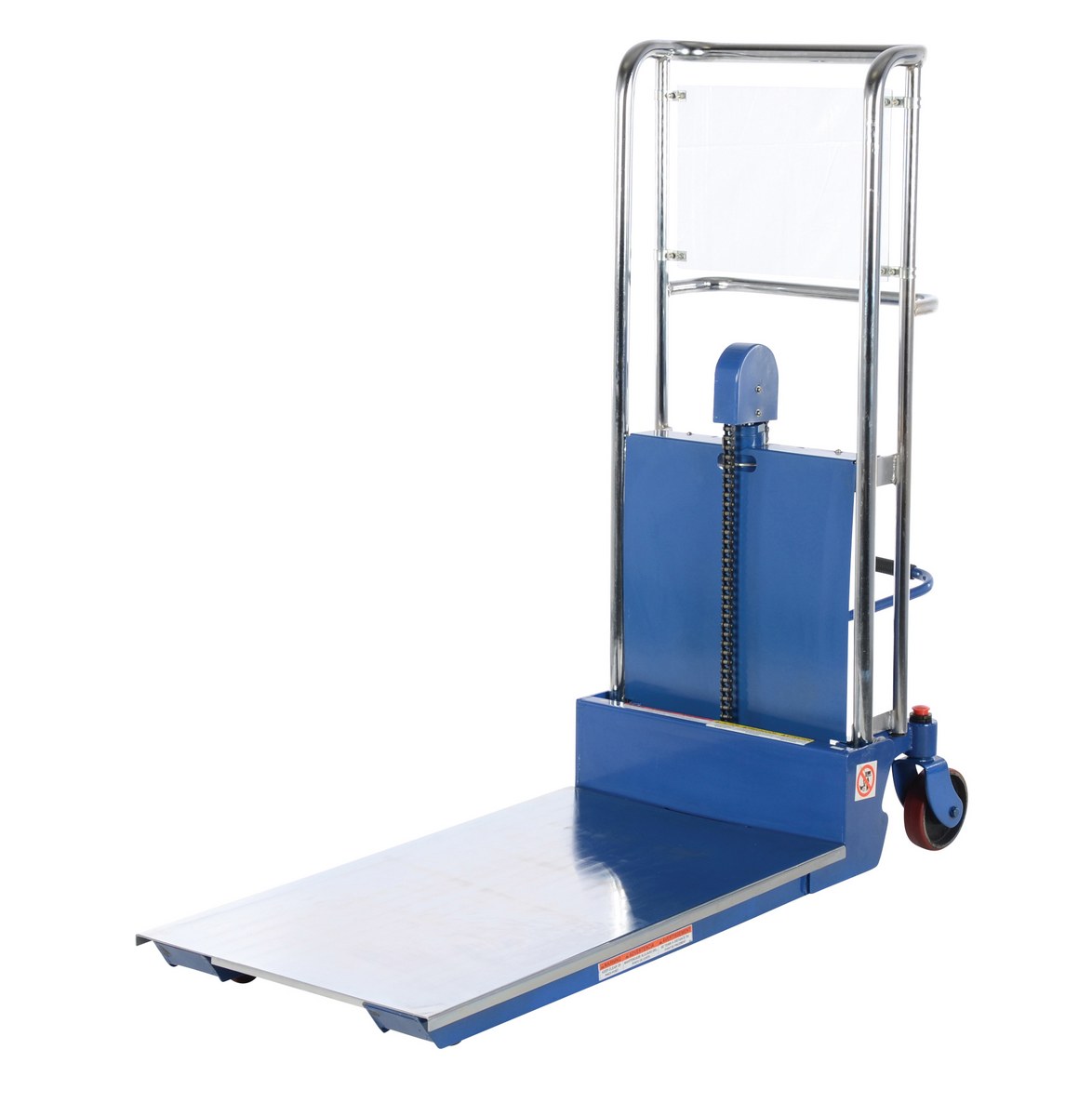 Steel Portable Foot Pump Hefti-Lift 60 In. x 54 In. 400 Lb. Capacity BlueThe Hefti-Lift is a user friendly, portable hydraulic lift. The lift provides reliable, power lifting when moving and positioning loads. It includes a removable platform for operation requiring forks. The non-slip chain is used for accurate positioning while the lift rolls easily on two rigid and two swivel poly-on-steel casters that includes a foot operated brake. The lift is all welded construction with a chrome platform and uprights. Not for use with pallets.