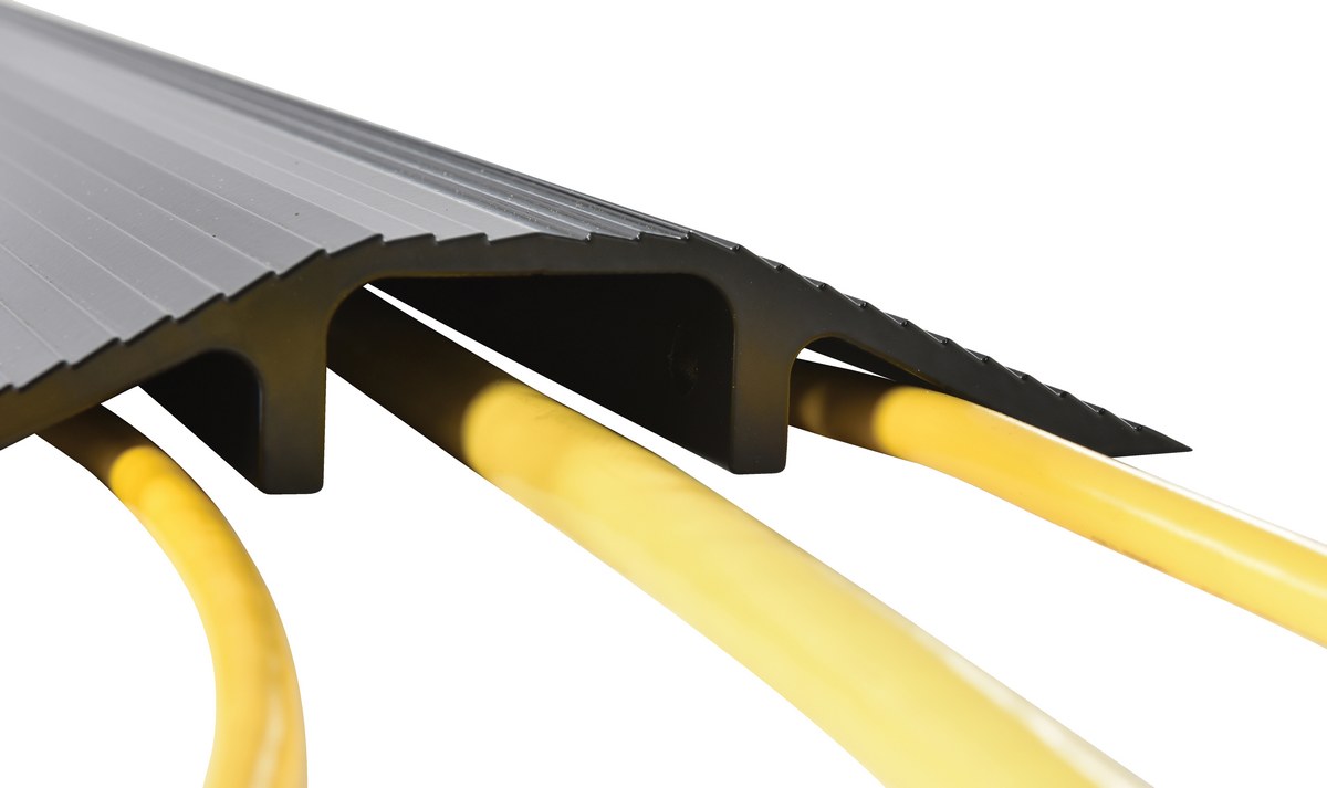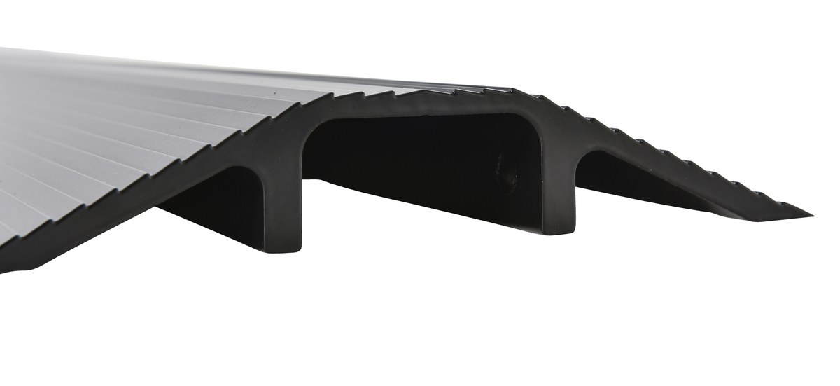 The Extruded Aluminum hose and cable Crossover is designed to protect air lines, electrical cords and computer cables from damage by fork trucks, carts, and personnel. This ramp has serrated edges for maximum traction and are lightweight for easy portability.