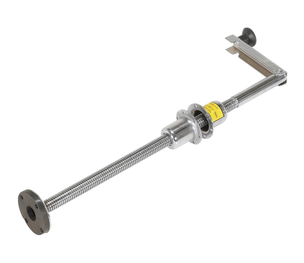 This leveling jack is designed for permanent installation, screw-style jack hold platforms and other equipment in place and stabilize them at the required height. Drill a one and one quarter inch (1-1/4") diameter hole through the platform to be leveled and bolt the platform between the upper and lower flanges of the jack's divided housing. Jack has a handle that folds down when not in use. Swivel base has a slip-resistant rubber pad on the bottom (replacement pads available).