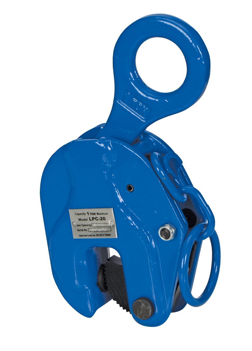 The vertical positive locking plate clamp grips a sheet until release ring is pulled. Serrated gripper is hardened tool steel. Forged head and gear. Lift only one (1) clean, oil free plate at a time. Safety factor is 2 to 1. Not designed to use on stainless steel or aluminum plates. For use with materials with a surface hardness to 30 RC (300 HB).
