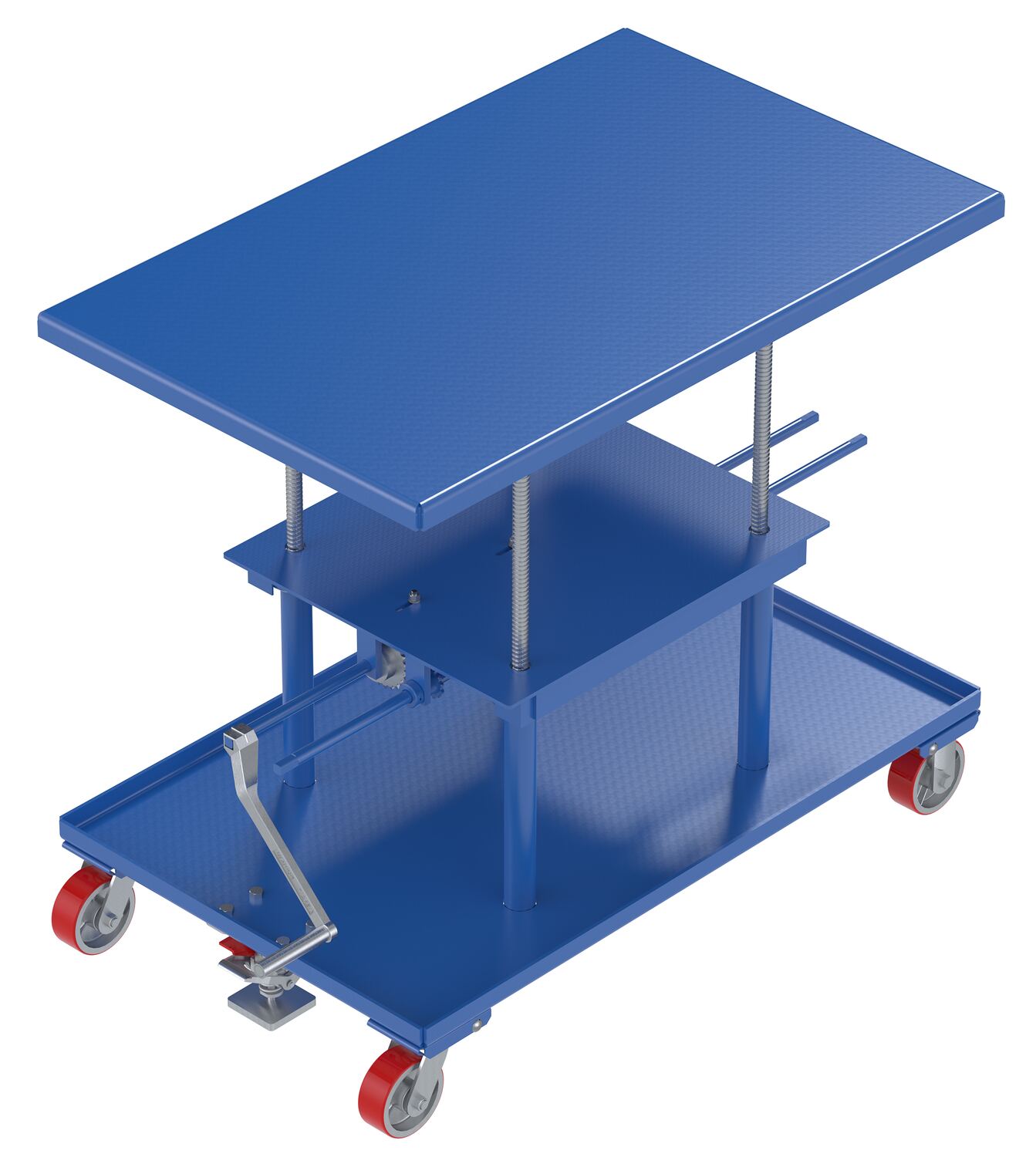 Steel Low Profile Post Table 30 In. x 48 In. 2000 Lb. Capacity BlueThe mechanical post table is an adjustable portable table that is well suited for a wide variety of material handling applications. It moves smoothly on two rigid and two swivel poly-on-steel casters. Includes bolted on adjustable floor lock. Provides positive height adjustment without a downward shift. It features a two-speed manual gear mechanism to move heavy loads.
