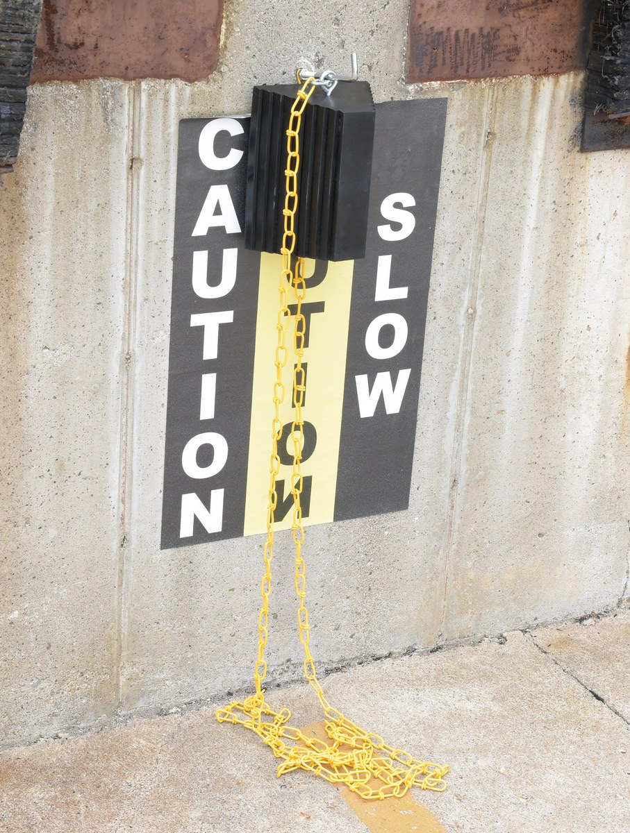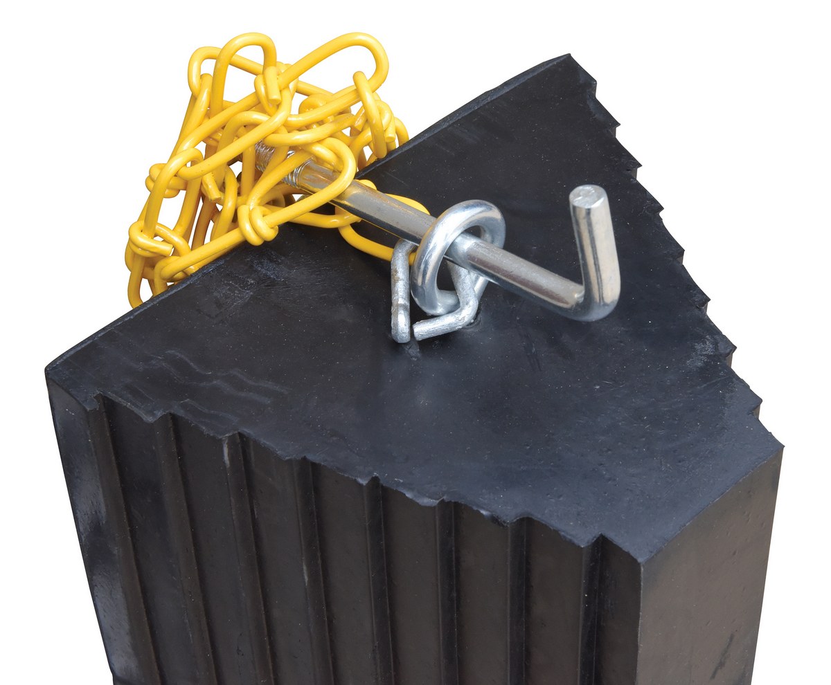 Discourage theft and misplacement of wheel chocks. Facilitate safety in the dock area. 15 foot chain attaches to the hanger. Hanger is then secured to the dock wall. Chain is fastened to the chock with cold shut.