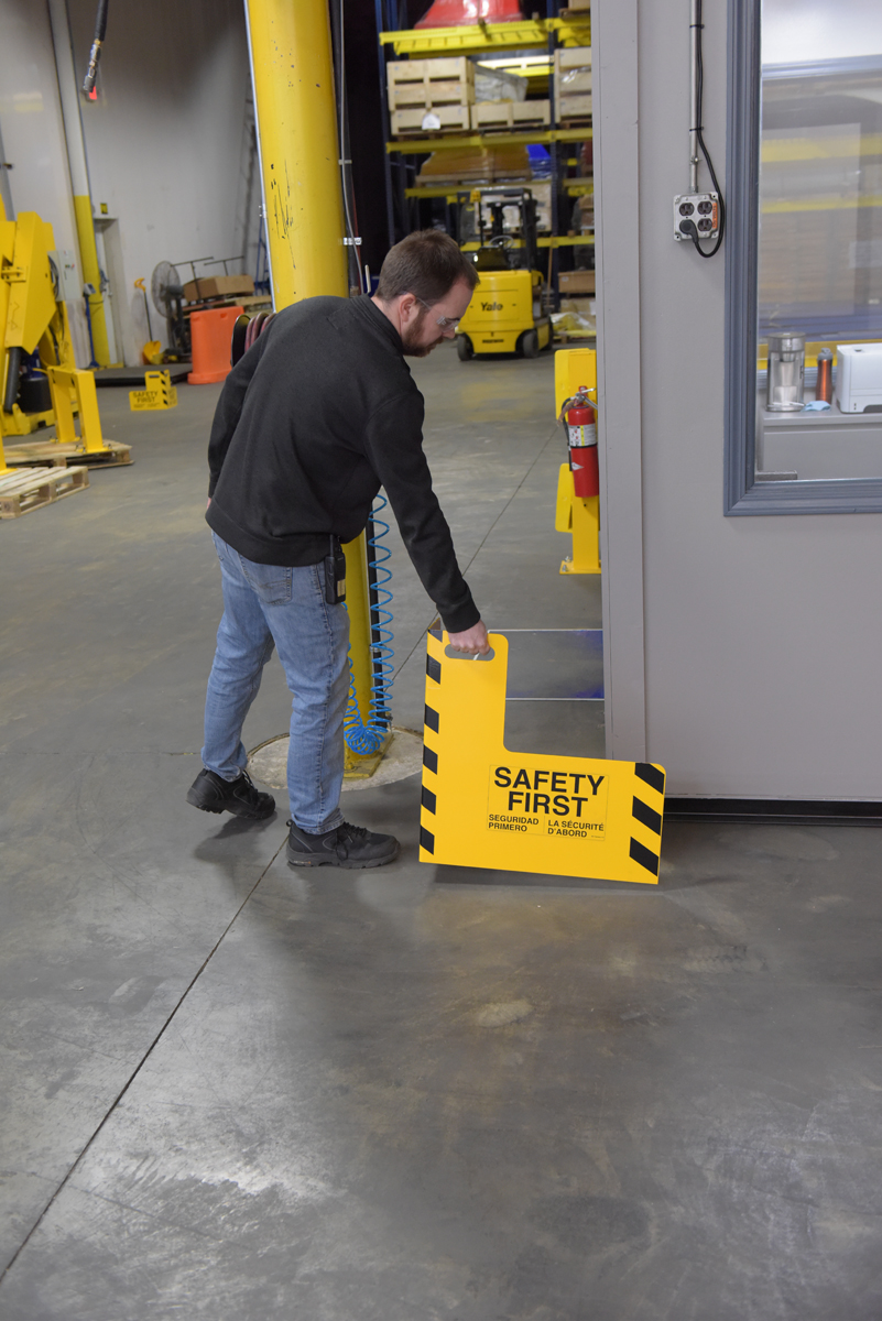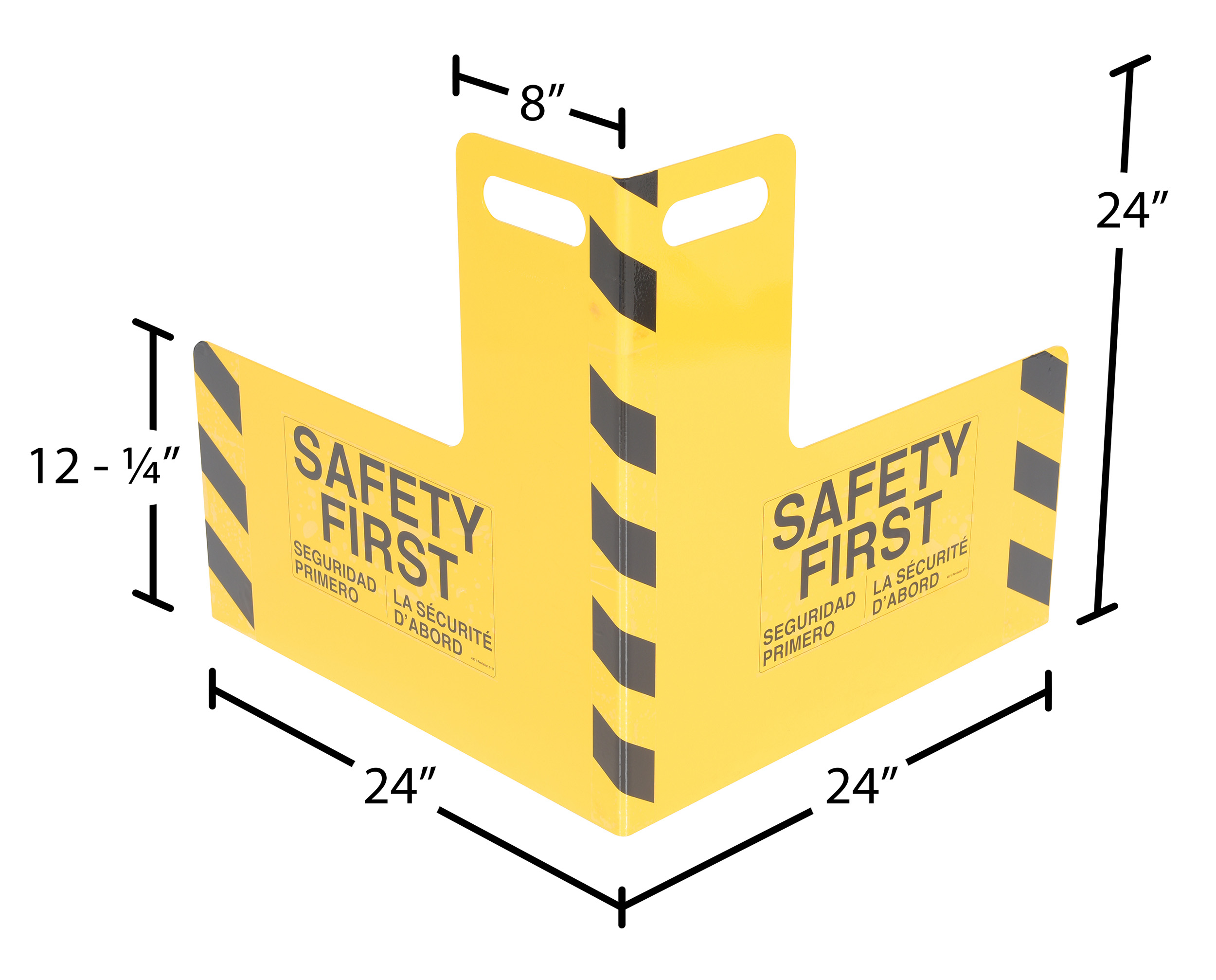 Protect busy corners, expensive machinery and personnel with this corner guard and its perpendicular protection. "Safety first" promotion reminds personnel of the number one priority. A built in handle allows for precise positioning and simple transference from area to area.