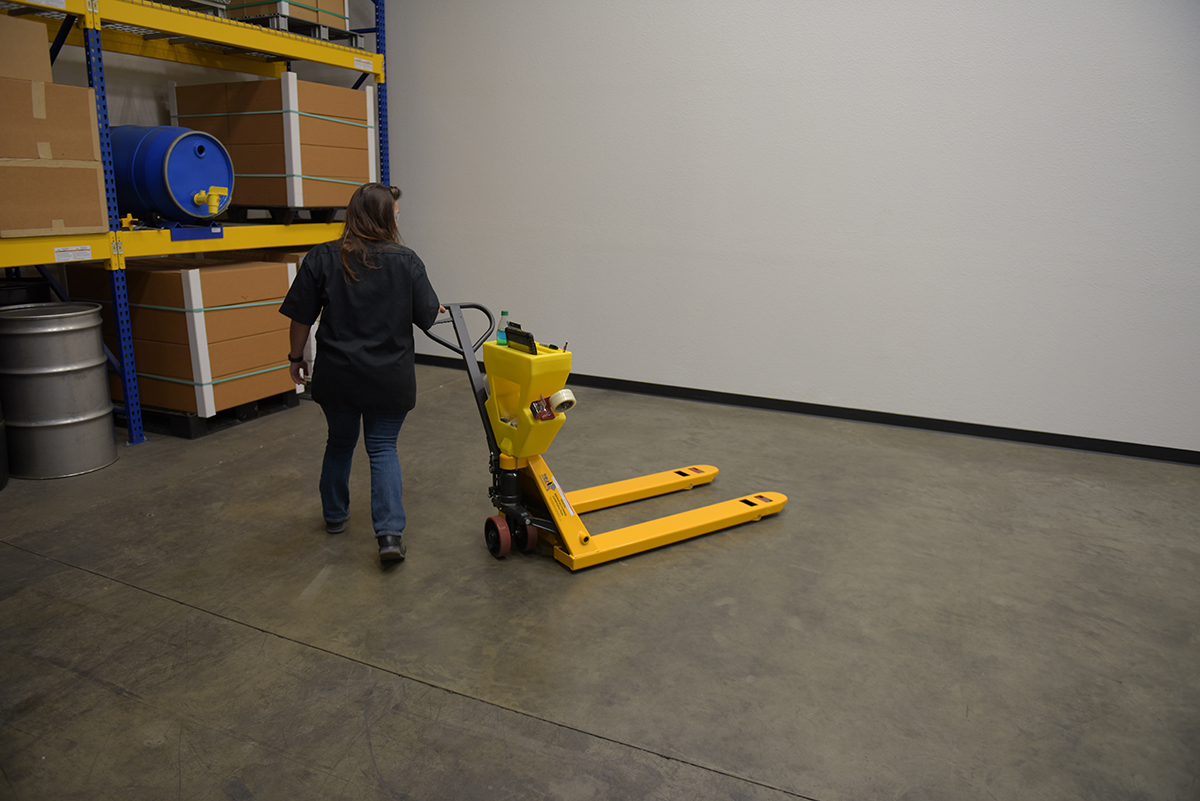 A pallet truck with a storage caddy is the perfect bundle of two innovative products. The pallet truck has an ergonomically friendly design with a limited pulling force required, while the caddy allows the user to be more organized and efficient. With a strong powder coated steel construction, the pallet truck moves easily between areas. Nose wheels are located on the front edge of each fork to assist in clean pallet entrance and exit. A molded plastic design allows the caddy to be durable throughout consistent daily use. Installation hardware and instructions included.