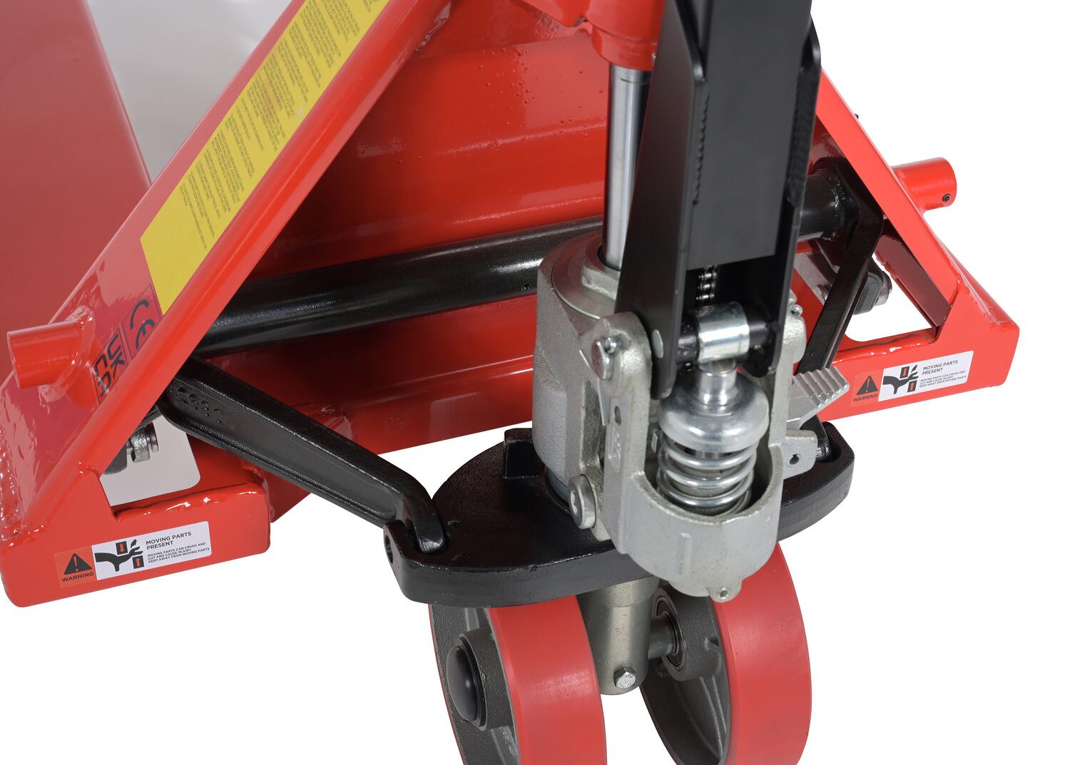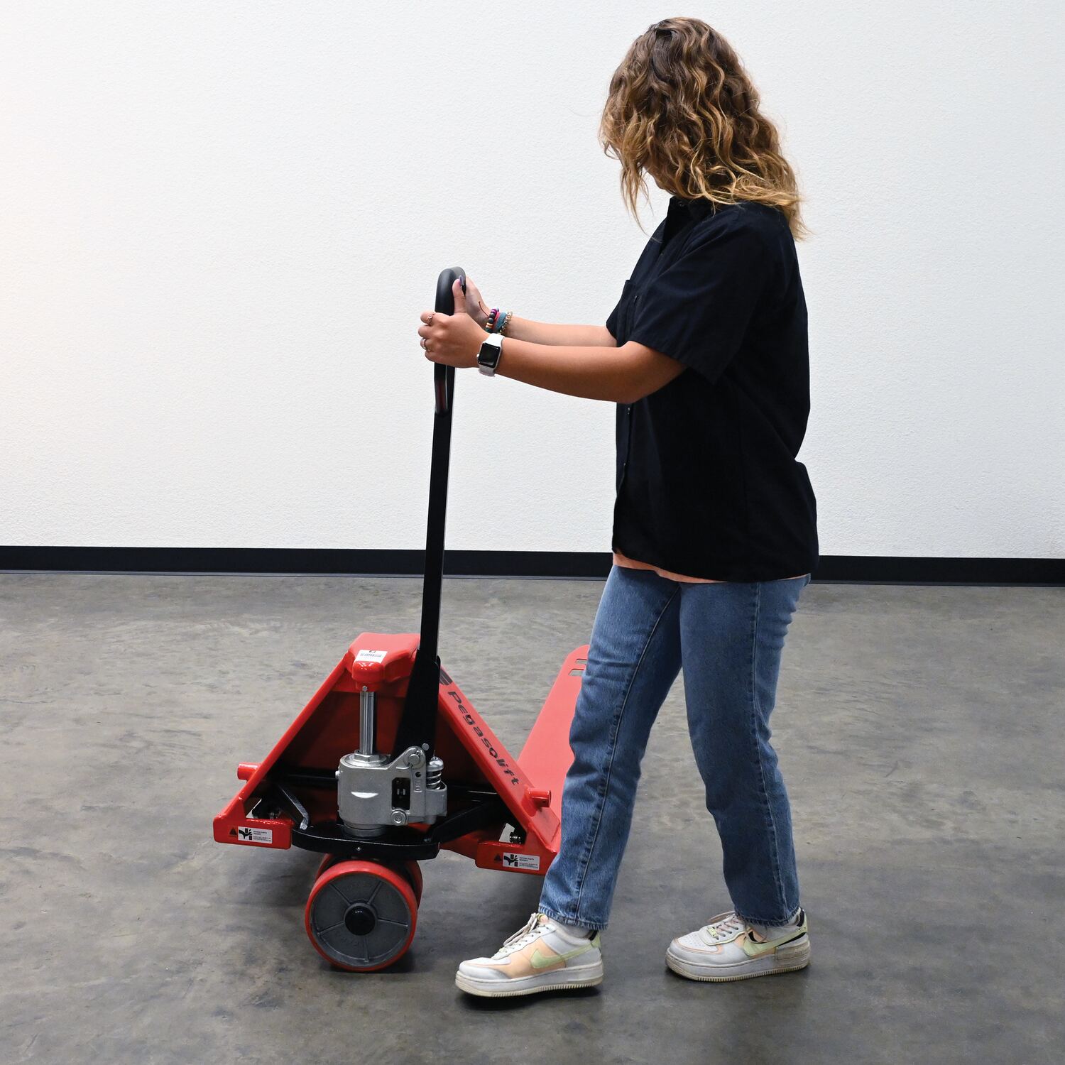 Steel Pegasolift Manual Pallet Truck 27 In. x 48 In. 5,500 Lb. Capacity RedThe full featured pallet truck is an economical way for one person to move heavy pallet loads without the use of a fork truck! Includes two (2) articulating steering wheels and two (2) front load rollers. Nose wheels are located on the front edge of each fork to assist in clean pallet entrance and exit. The unit is equipped with internally mounted solid steel adjustable push rods. A chrome-plated hydraulic pump piston supports long seal life, while the hydraulic pump design facilitates simple seal replacement when needed.