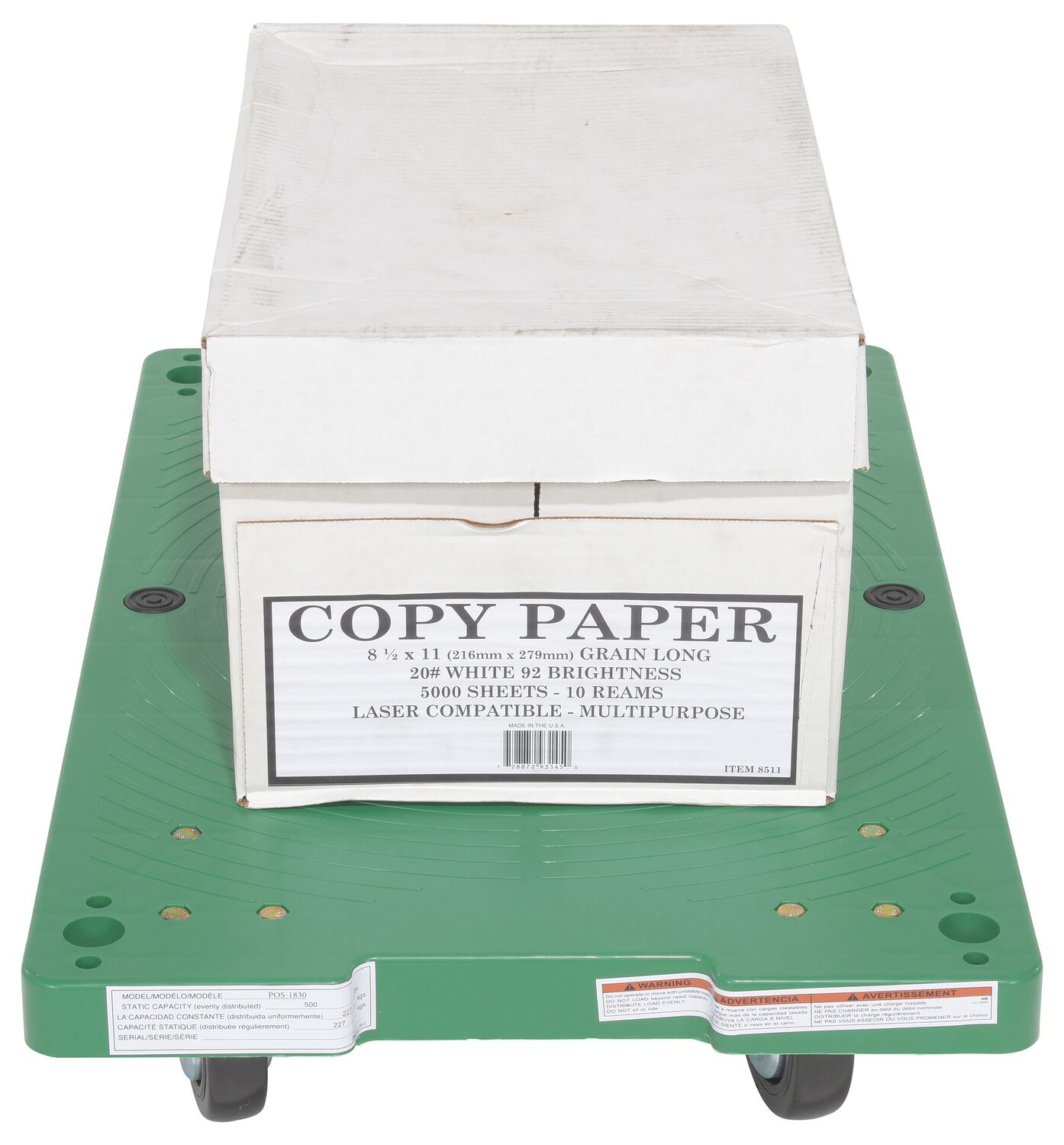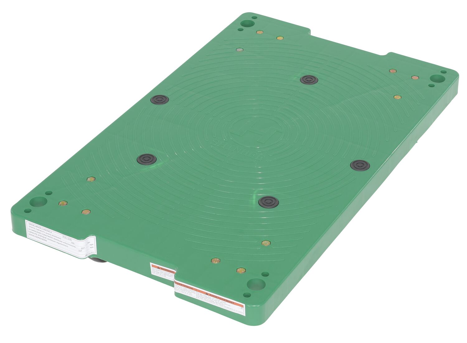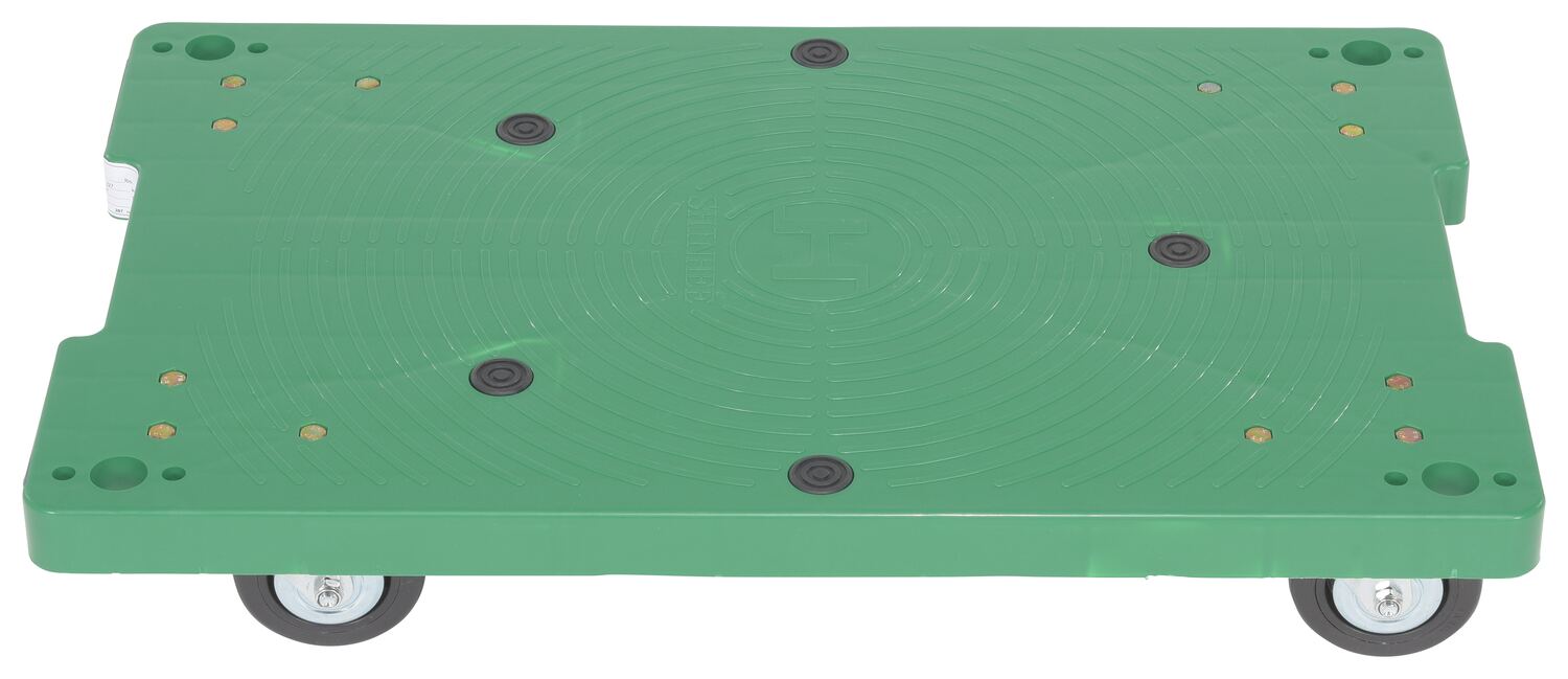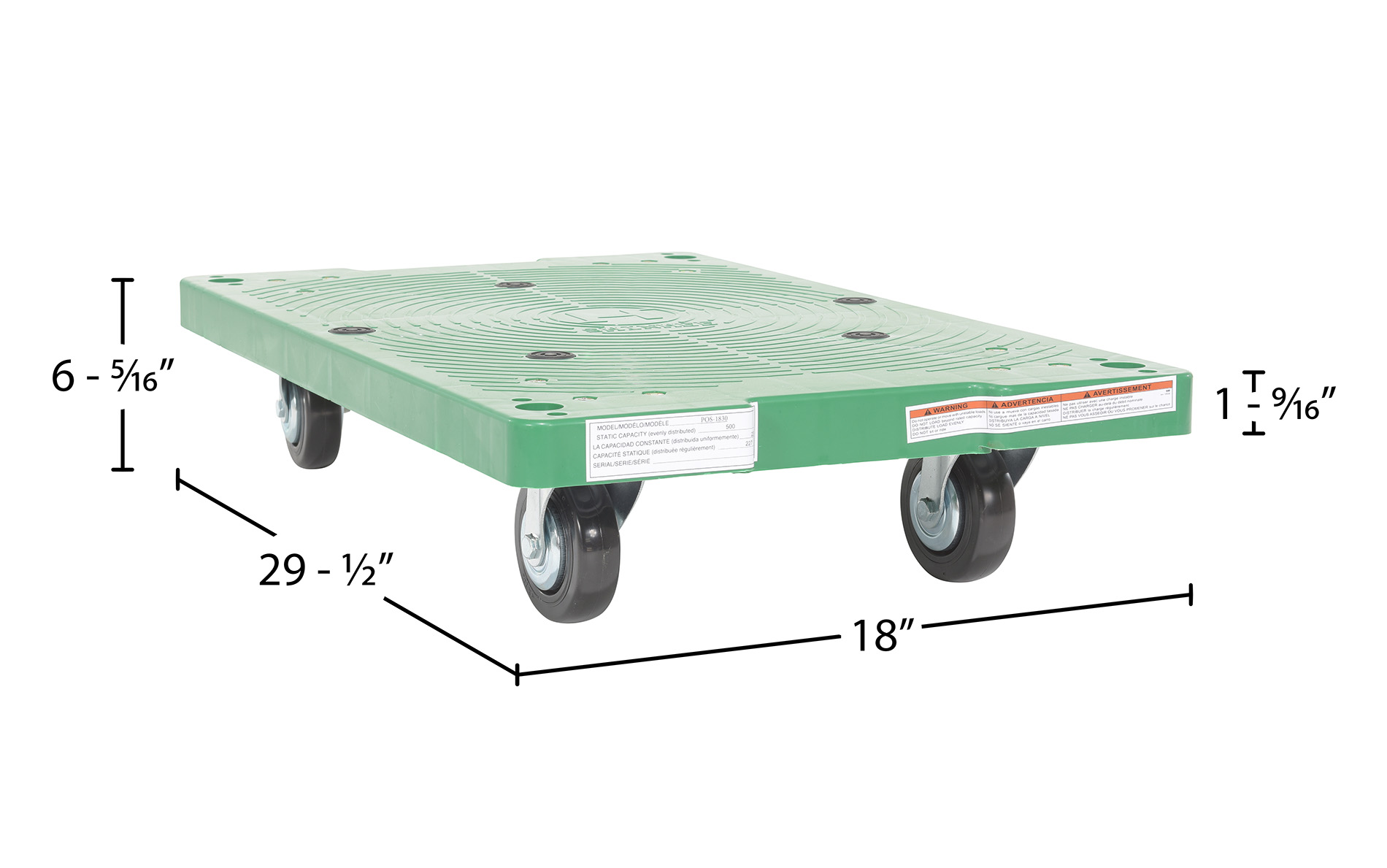 Polyethylene Dolly 30 In. x 18 In. x 6-5/16 In. 500 Lb. Capacity GreenThis plastic dolly is one (1) piece molded polyethylene. It is very lightweight and easy to clean. Will not rot, warp, dent, or splinter like wood dollies. Ideal for the food service industry. Unit comes standard with poly-on-poly casters.