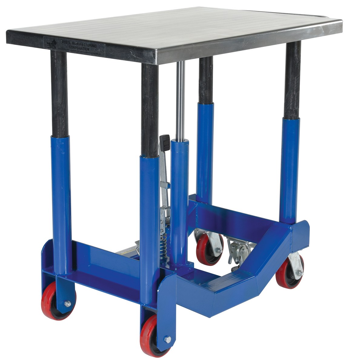 Steel Low Profile Post Lift Table 41 In. x 24 In. x 25 In. 4000 Lb. Capacity BlueHydraulic post tables are ideal in material handling facilities. The unit can be of use in a variety of environments from lifting dies and castings to moving machine parts. The corner posts are telescoping to help stabilize and fully support the load during operation. The tables roll smoothly on two (2) locking swivel casters with brakes and two (2) rigid. The tables can be lifted/lowered with a single speed foot pump, two-speed foot pump, two speed auto shifter that automatically shifts when the table is loaded, or linear actuated power.