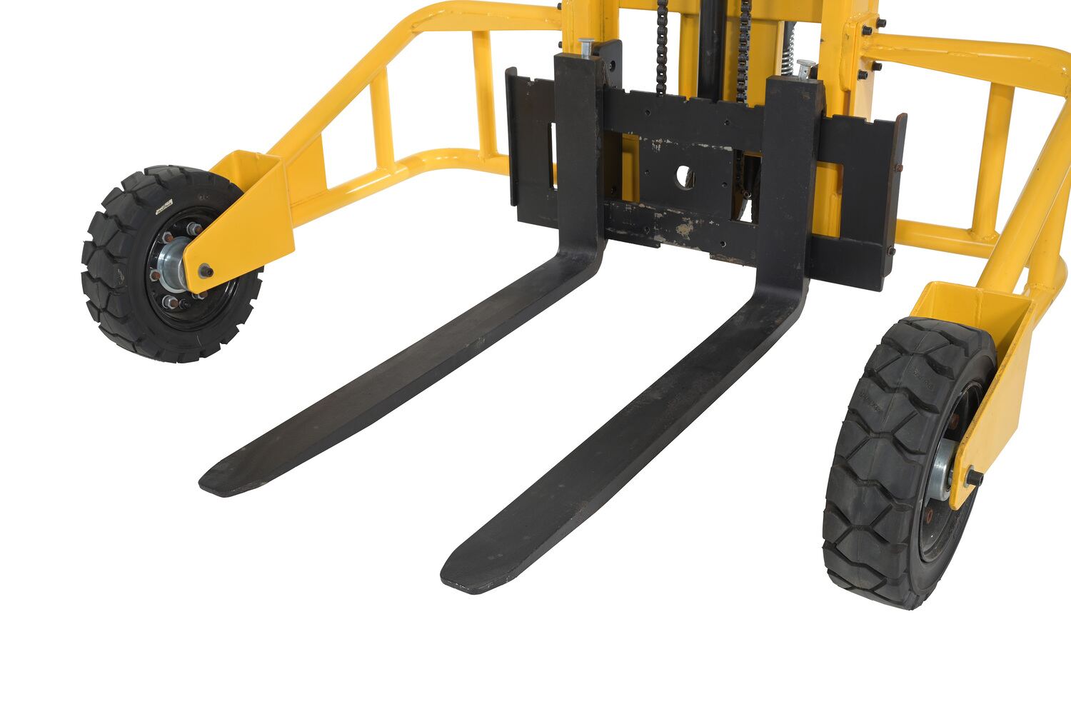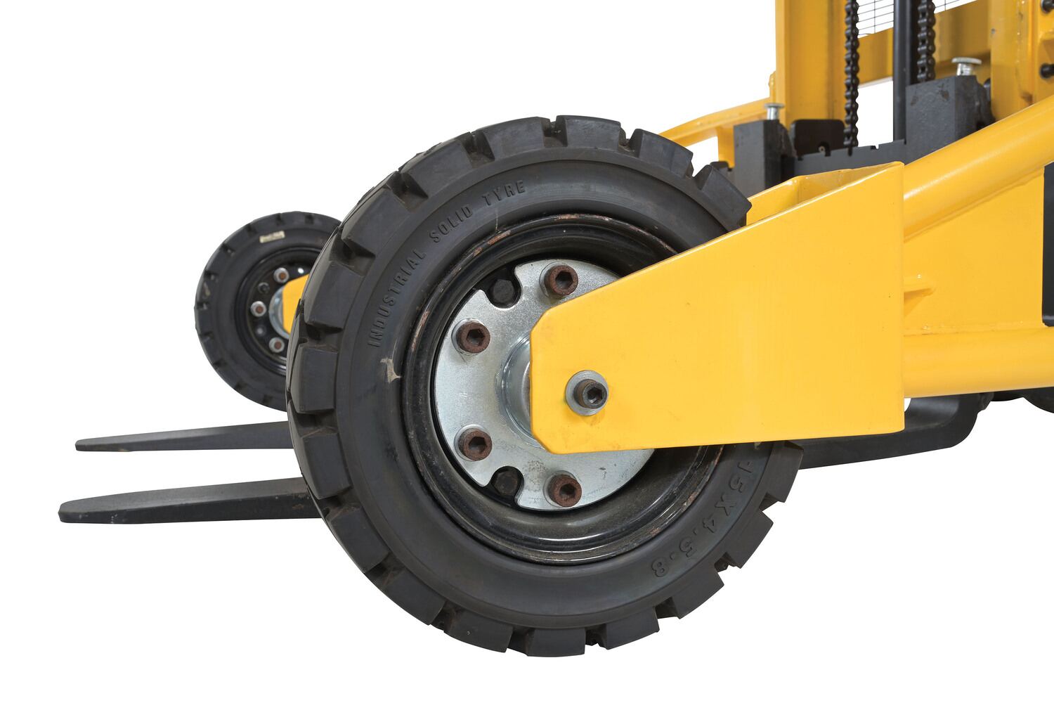 A rough terrain stacker is capable of going where other stackers can't. The manual design benefits the user by giving precise movement of the unit in particular areas. A simple handle pump lifts and lowers, without the need for mechanical power. Just a simple hydraulic action leads the forks up or down to the desired height. The rubber tires provide stability when traversing rough or uneven surfaces. Baked in yellow powder coat finish.