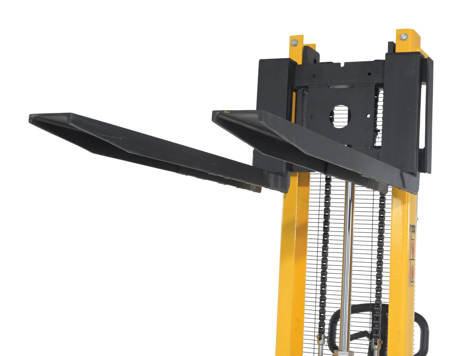 A rough terrain stacker is capable of going where other stackers can't. The narrow design provides precise movement in condensed areas. A handle pump design lifts and lowers, without the need for mechanical power. Just a simple hydraulic action leads the forks up or down to the desired height. The rubber tires provide stability when traversing rough or uneven surfaces. Baked in yellow powder coat finish.