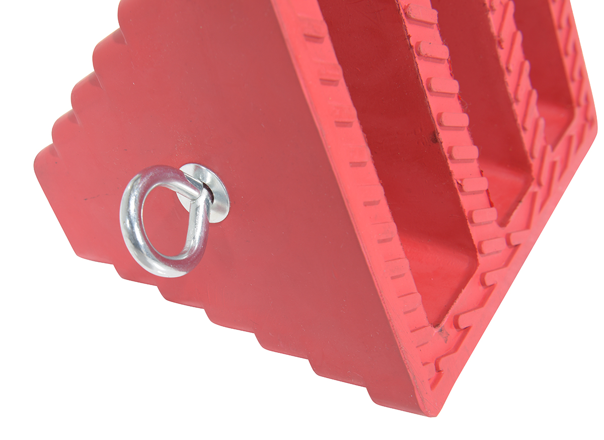 Rubber Wheel Chock with Eye Bolt 9 In. RedA rubber wheel chock is perfect for on the road or in the shop. The tiered rubber design enables the chock to hold more surface area, providing a secure tire position. With a compact, lightweight construction the chock is simple to handle and takes up minimal storage space. Eye bolt is included, giving the user the ability to add additional security to the chock.