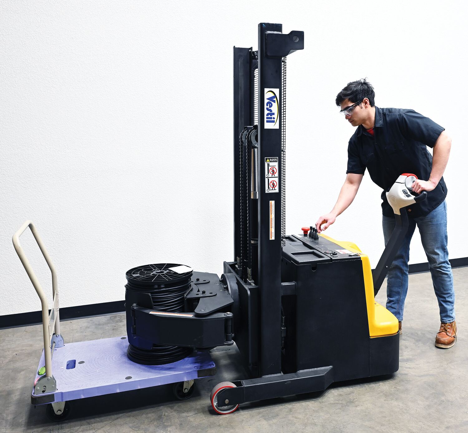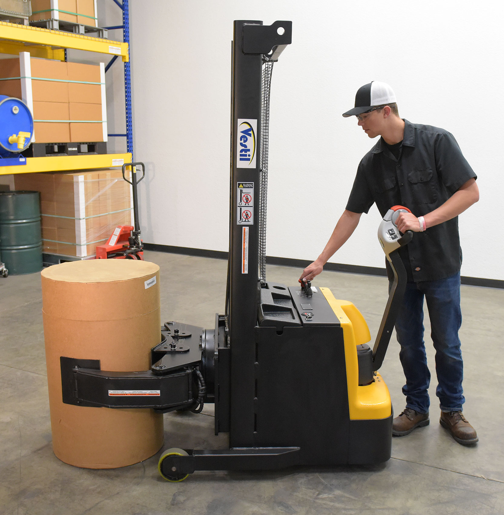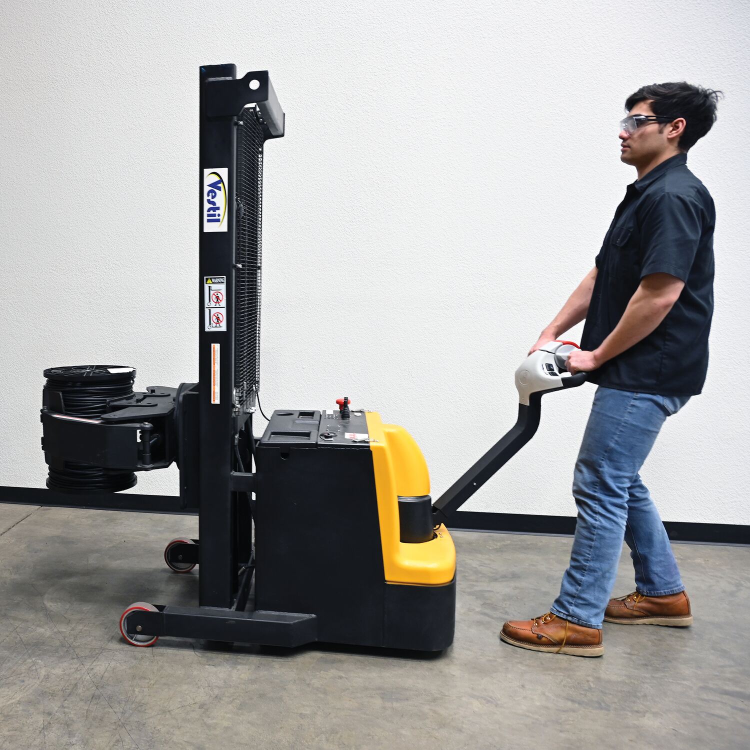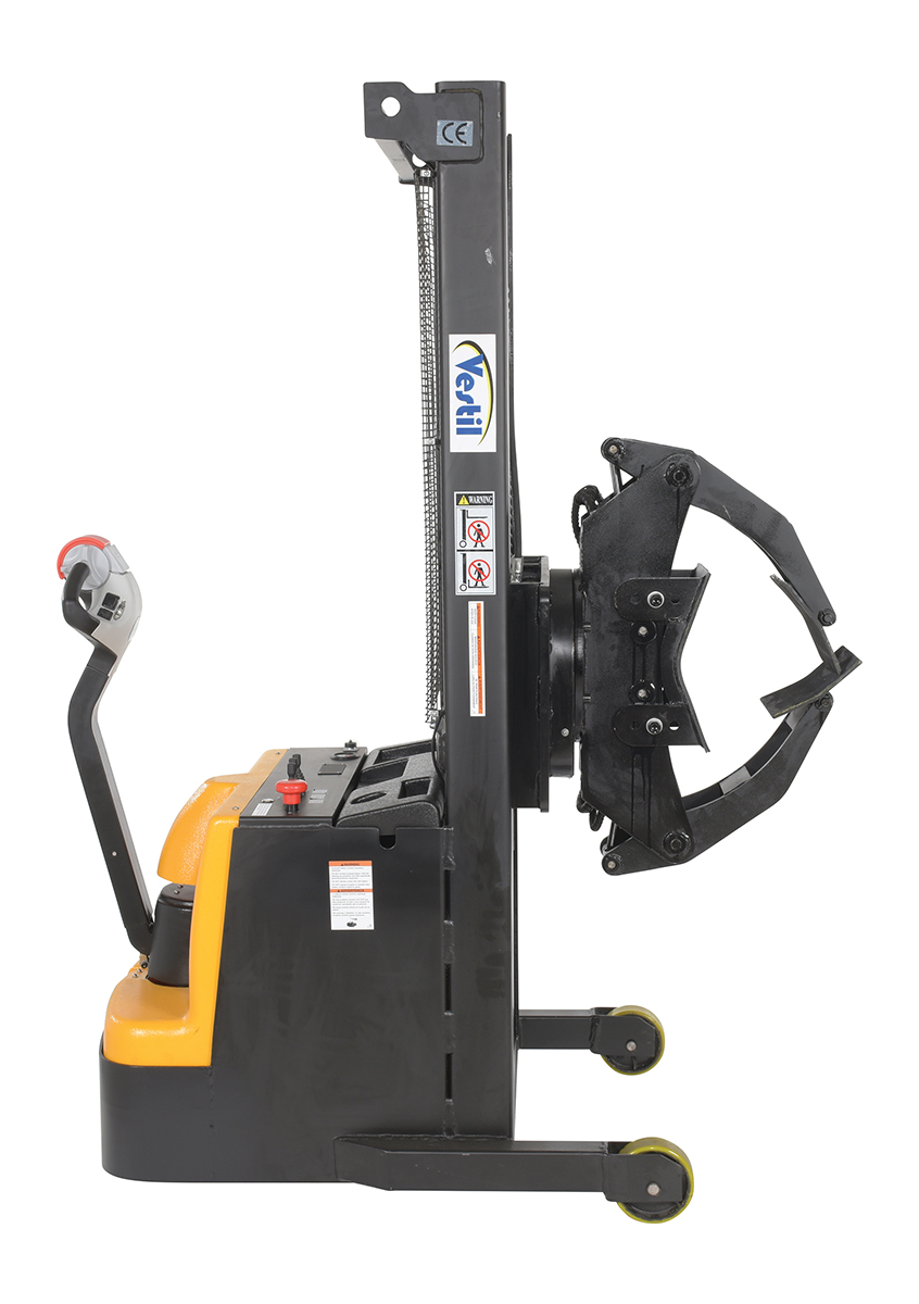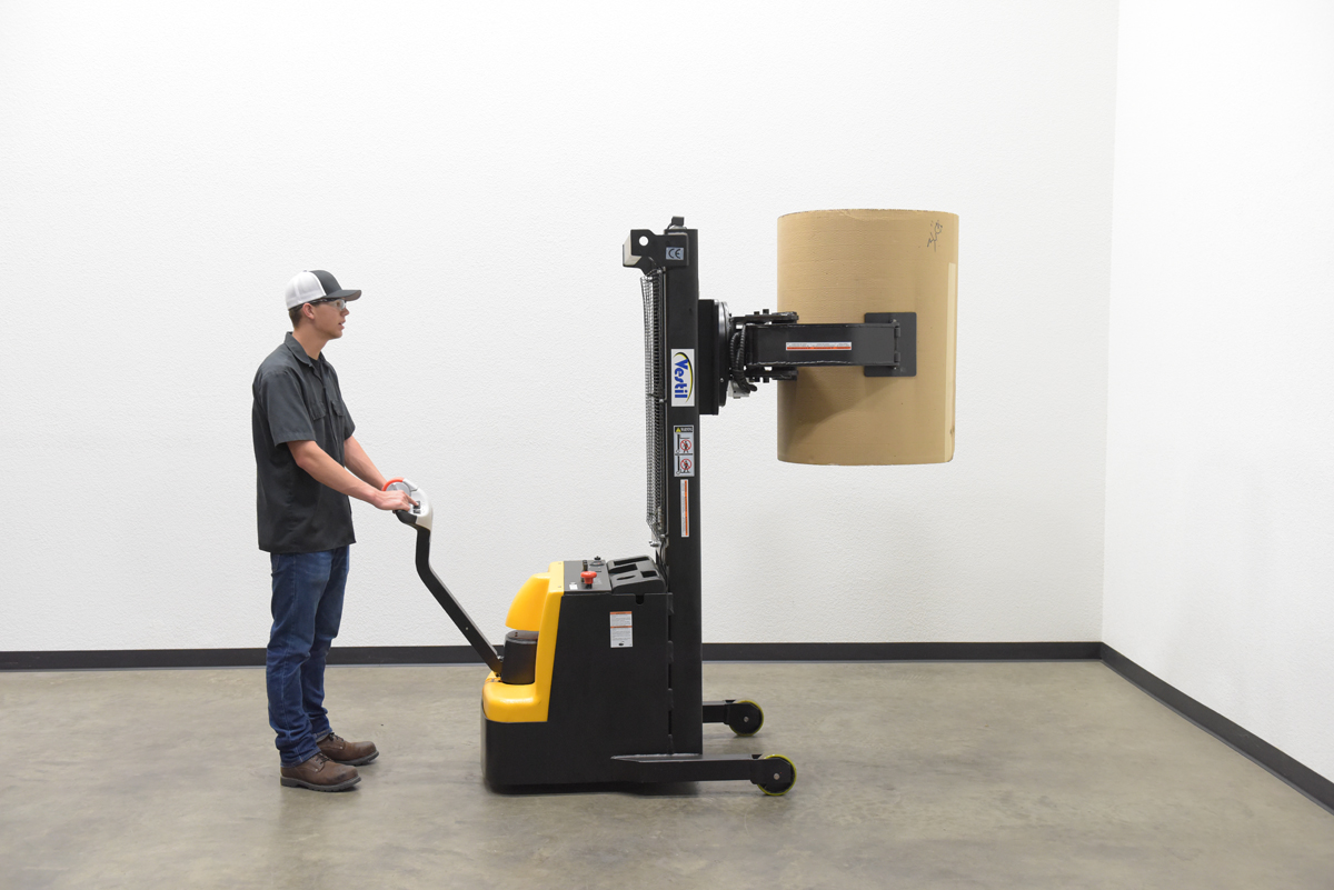 A vertical roll gripper/rotator is perfect for the manufacturing and distributing industries. A walk behind design with a single handle control makes maneuvering into the desired position easy. The compact design allows the unit to get into small areas where other lifting devices can't reach. A robust lifting capacity lets users transfer more rolls in fewer trips, maximizing efficiency. Long term battery charge allows for constant daily use without needless downtime. Powder coated finish for added baked in toughness.