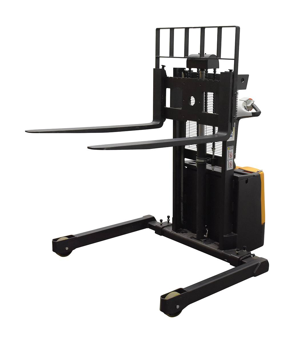 Steel Adjustable Double Mast Stacker 43 In. Raised Height 3,000 Lb. Capacity Black / YellowA fully powered electric stacker transports loads throughout warehouse facilities quickly and with ease. Ergonomic handle features lift/lower controls, adjustable forks/adjustable legs and horn Stackers can be easily maneuvered in condensed areas where space is limited. Steel construction with a powder coated for built in toughness. Horn included.
