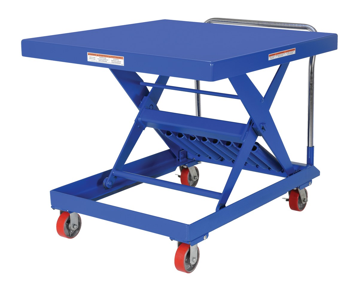 Steel Auto Hite Cart 48-3/16 In. x 42 In. x 37-5/8 In. 2,000 Lb. Capacity BlueThe auto-Hite cart raises and lowers as materials are removed or added to the platform, keeping material at an ergonomic work height. It increases efficiency while reducing potentially harmful bending and twisting motions. Carts utilize tension springs which can be adjusted in order to fit each particular application. The unit has an all steel construction with a removable handle and rolls smoothly on polyurethane casters, two (2) rigid, and two (2) swivel with brake.