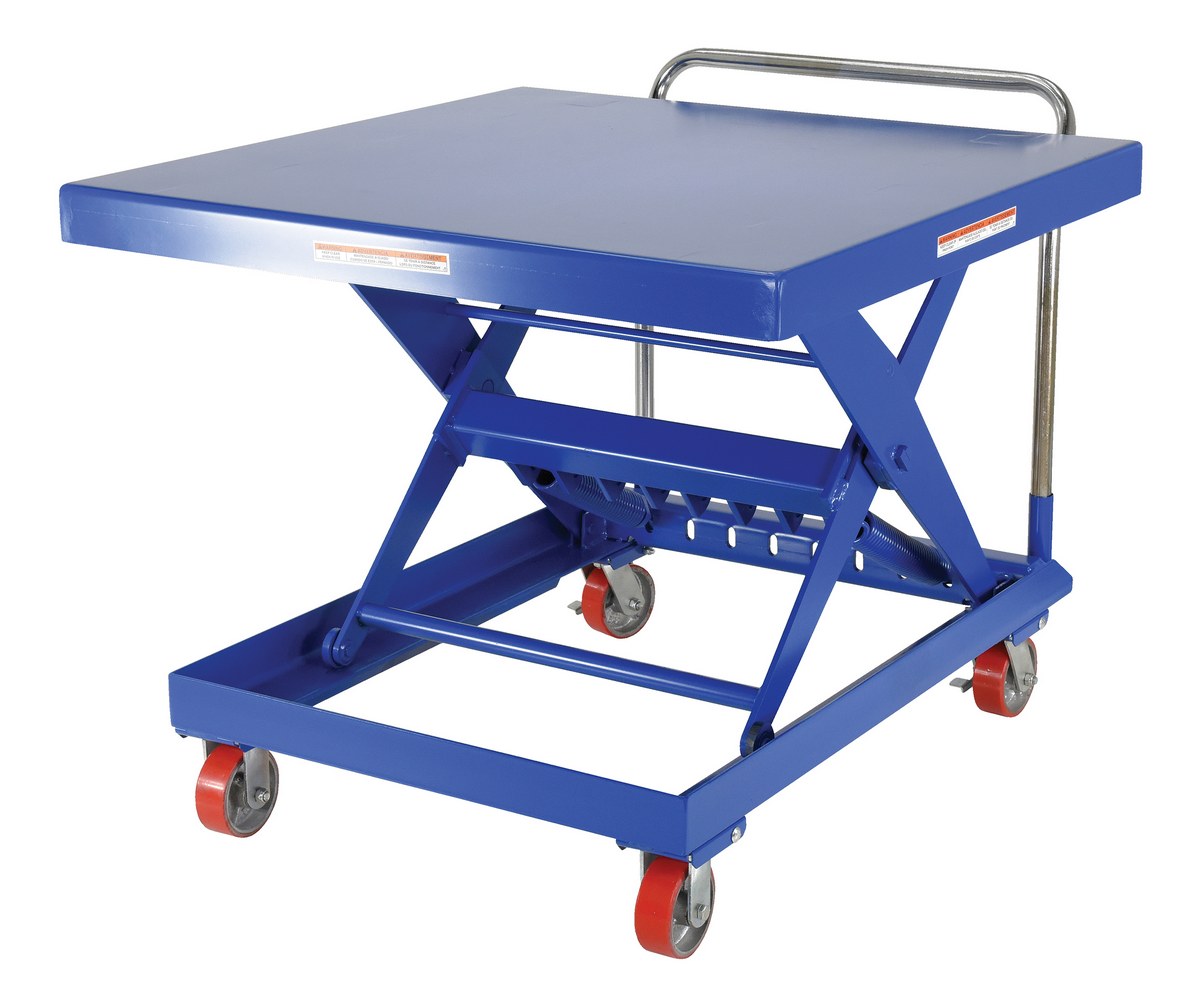 Steel Auto Hite Cart 47 In. x 42 In. x 37-5/8 In. 500 Lb. Capacity BlueThe auto-Hite cart raises and lowers as materials are removed or added to the platform, keeping material at an ergonomic work height. It increases efficiency while reducing potentially harmful bending and twisting motions. Carts utilize tension springs which can be adjusted in order to fit each particular application. The unit has an all steel construction with a removable handle and rolls smoothly on polyurethane casters, two (2) rigid, and two (2) swivel with brake.