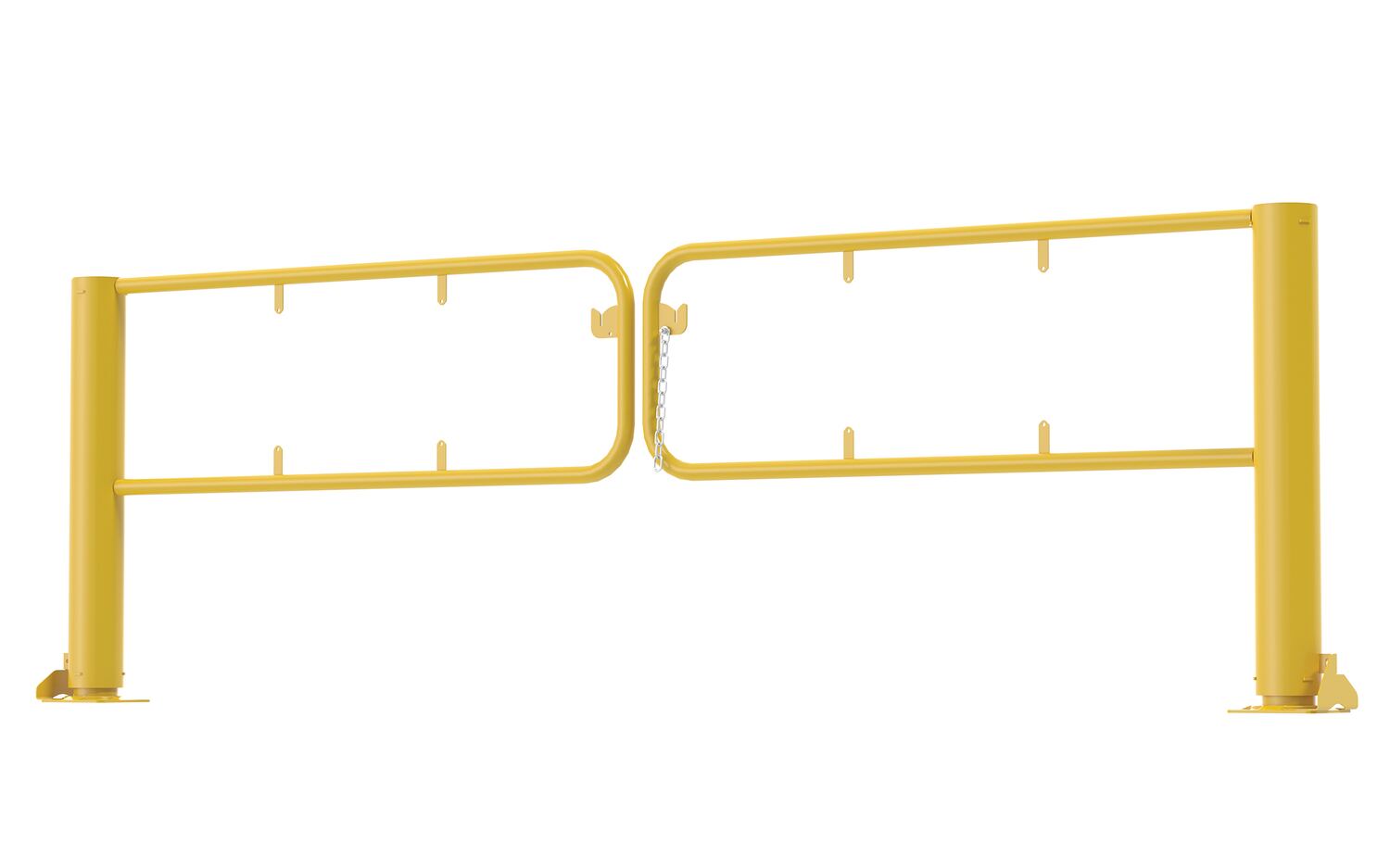 Swivel dock gates are ideal for securing loading docks, parking lots, or other pathways. The gate features a steel construction for durability and a yellow powder coat finish for clear visibility. A chain and chain slots are provided on the ends of the gate arms for securing the gate in the close position, for added safety. Four built-in tabs are included on each gate (eight tabs per pair). These tabs allow a sign to be attached and secured in place between the upper and lower bars of the gate. The open design makes it easy for single or double sided signs to be utilized. Standard and custom sign designs are available separately.