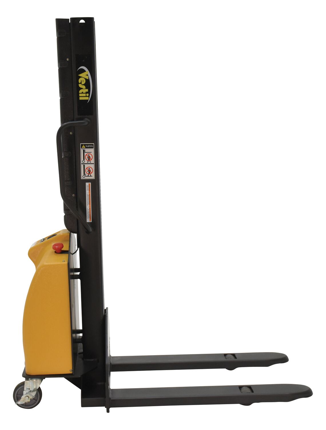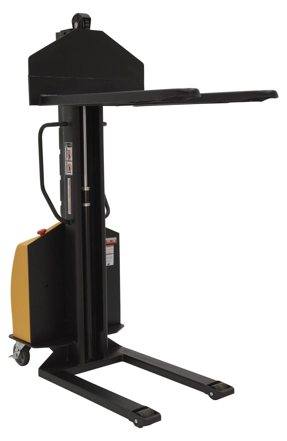 Steel Narrow Mast Stacker DC Powered 63 In. Raised Height Fixed Forks 45-1/4 In. Fork Length 1,000 Lb. Capacity Yellow