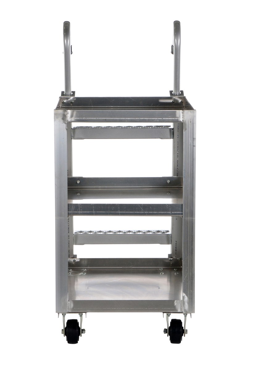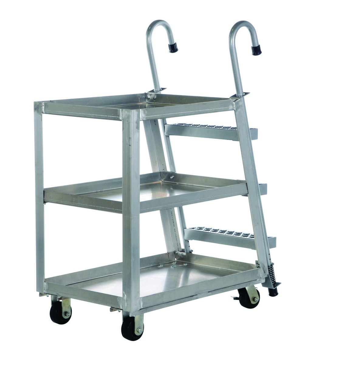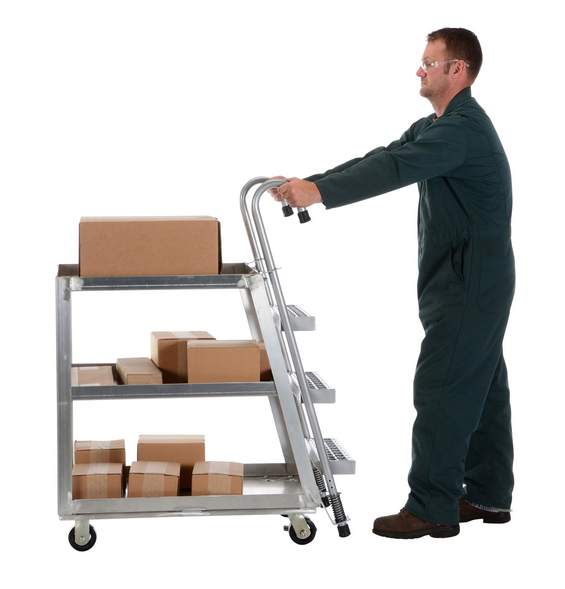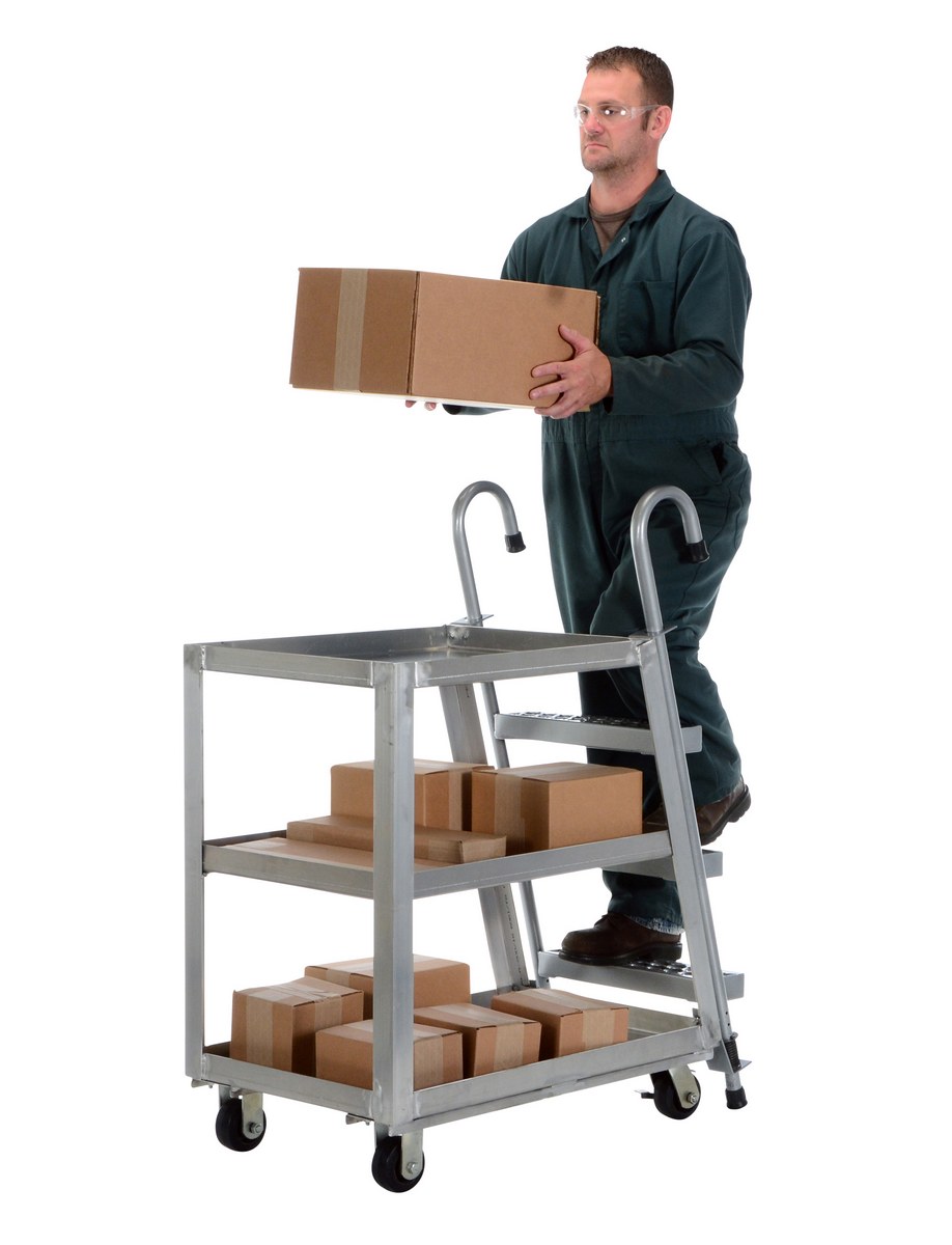 Combine the mobility of a cart with the versatility of a step ladder with this stock picker truck. Convenient spring loaded steel step ladder holds the cart securely in place while a person is standing on the ladder. Crutch tip ladder prevents the cart from moving while stocking. Springs then return the ladder to the raised position once personnel exit the step. All shelves have the lip turned up to prevent items from falling off. Ladders have a baked in silver powder coated finish.