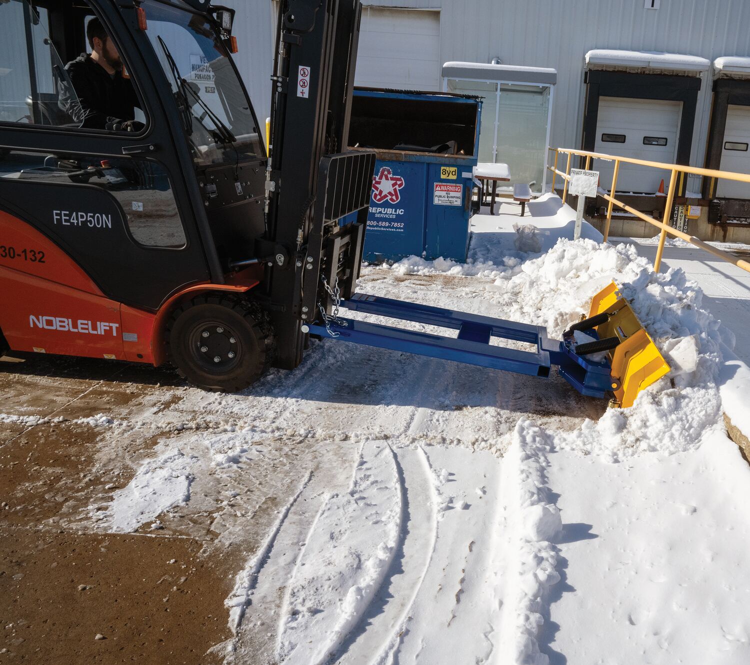When snow needs moved and removed, look no further than the fork truck snow plow. The unique design attaches to fork truck forks, so no power supply is needed! The design of the plow keeps the weight to the back of the unit, towards fork truck mast. Manual pivot mechanism for angled plowing on both sides. Steel construction with baked in powder coat finish for added toughness.