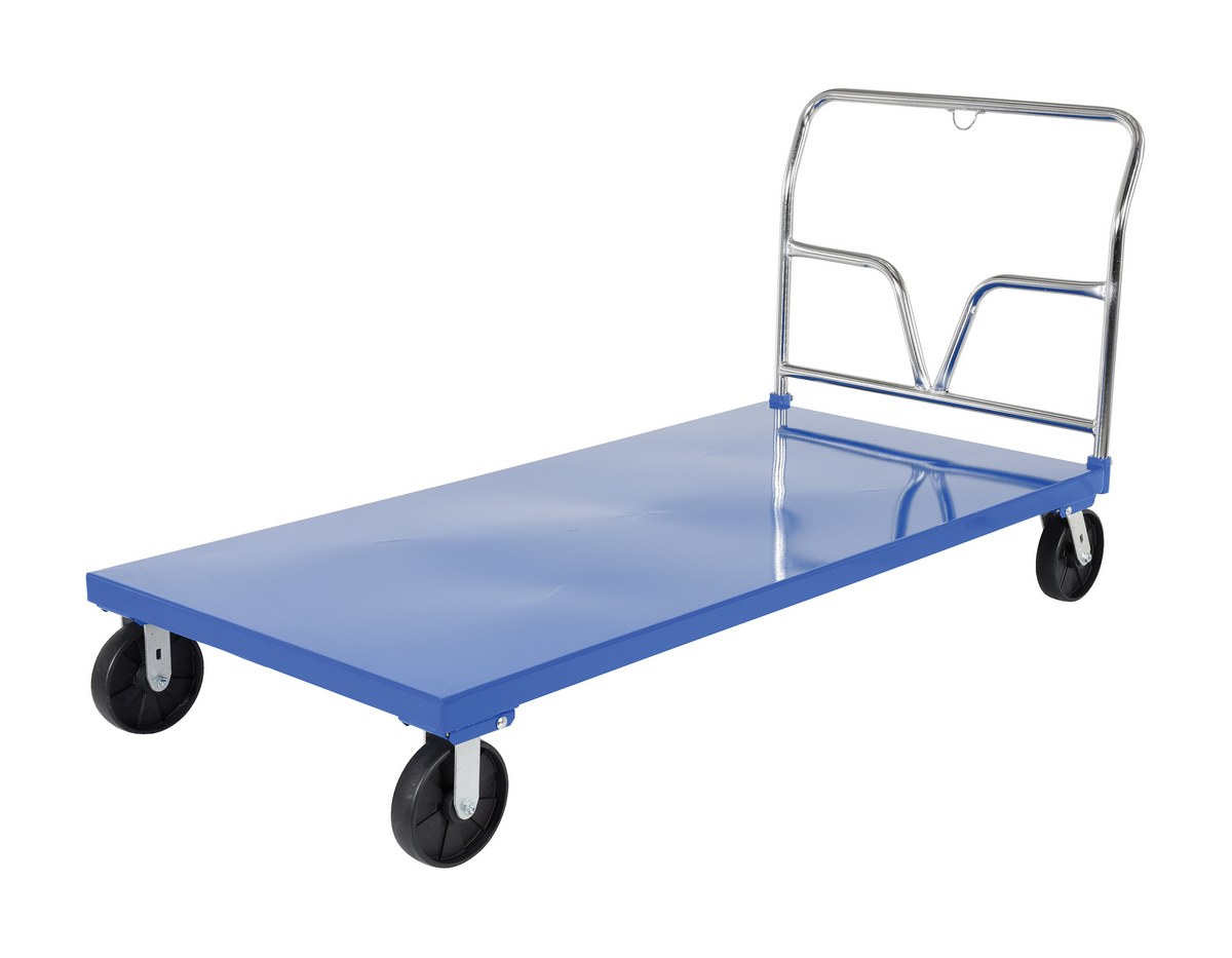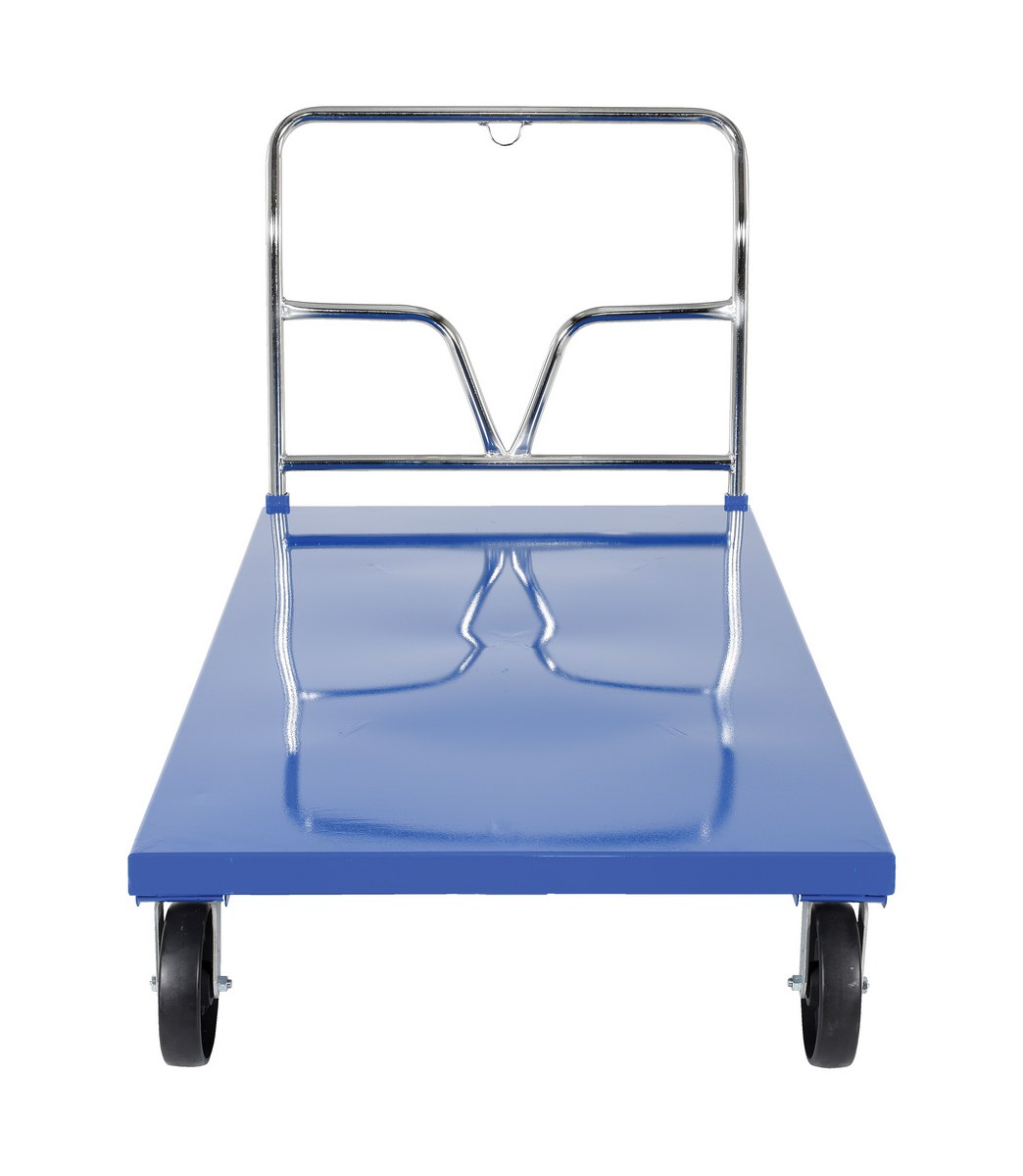 This steel Platform Truck with solid, smooth steel deck is all welded and features structural reinforcement underneath for extra strength. Includes one (1) removable high-polished steel handle and rolls smoothly on two rigid and two swivel casters. Comes standard with a floor lock and a durable blue powder coat finish.