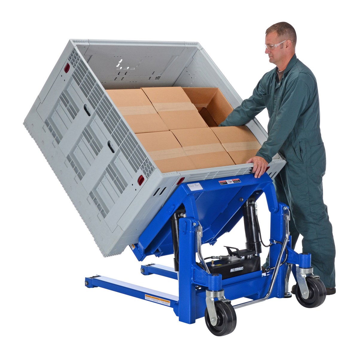 The tilt master lifts and positions filled tote boxes or baskets without the need of a fork truck or lift table using the newly designed heavy-duty tilt master. The tilter will function as transporters by moving completed products from work station to work station without waiting for a fork truck. The lift has a thin profile to allow the user to get as close to the load as possible, a standard floor lock and rolls easily on the phenolic steering wheels. It is designed to be used with open bottom pallets or skids. The unit is powered by an air pneumatic motor.