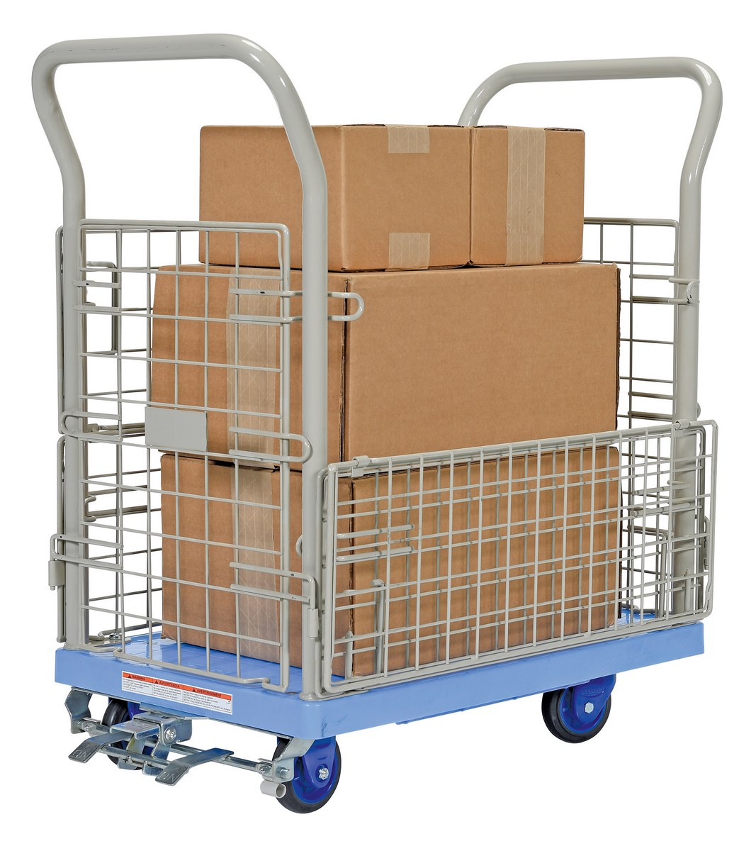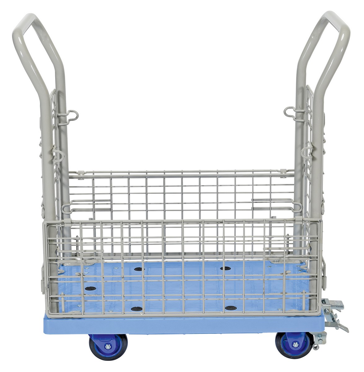 Plastic Truck Mesh Sides with Floor Brake 36-1/4 In. x 20 In. x 33-1/2 In. 330 Lb. Capacity BlueThe plastic platform cart is a great addition to the shipping and distributing facilities. The plastic platform creates a durable, yet lightweight construction that can be transferred simply from workstation to workstation. The unit rolls on casters for smooth transference over a variety of terrains, while the side nets enable the utmost security. The attached handle creates a more ergonomic posture of personnel during use, while the brake keeps the unit steady when not in progress.