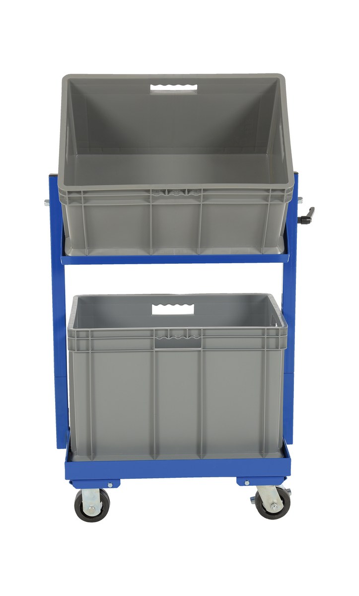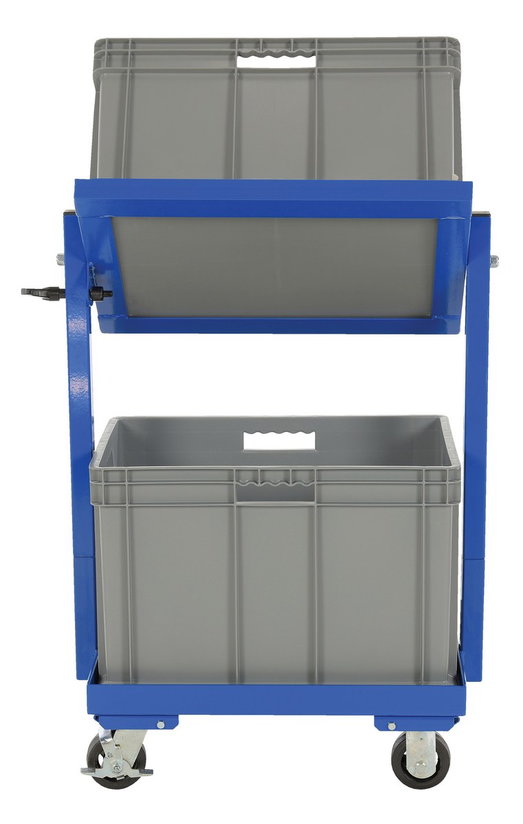 Steel Multi-Tier Cart with 2 Shelves and 2 Baskets 200 Lb. Static Capacity BlueThis unique multi-tier stock cart makes it easy to organize and reach parts. Tilting shelf allows easy access to baskets. Ideal for stocking parts in work stations. Casters allow the parts to be moved to wherever they are needed. Shelf angle is locked with a single handle design easier on the hands and allows user to apply more torque for a tight grip, handle is also "indexable" allowing for operation similar to a ratchet. Shelves include a lip on all four sides. The vertical uprights knock-down for more convenient shipping and storage. Overall cart size does not include baskets. Rolls smoothly on casters. Steel construction with a powder coat finish. Baskets included.