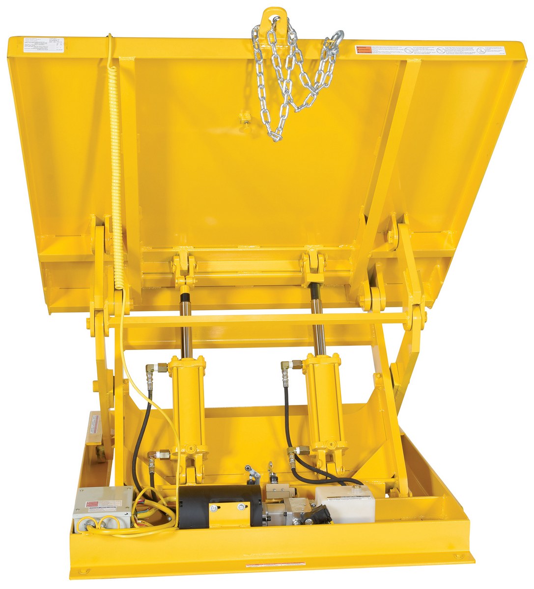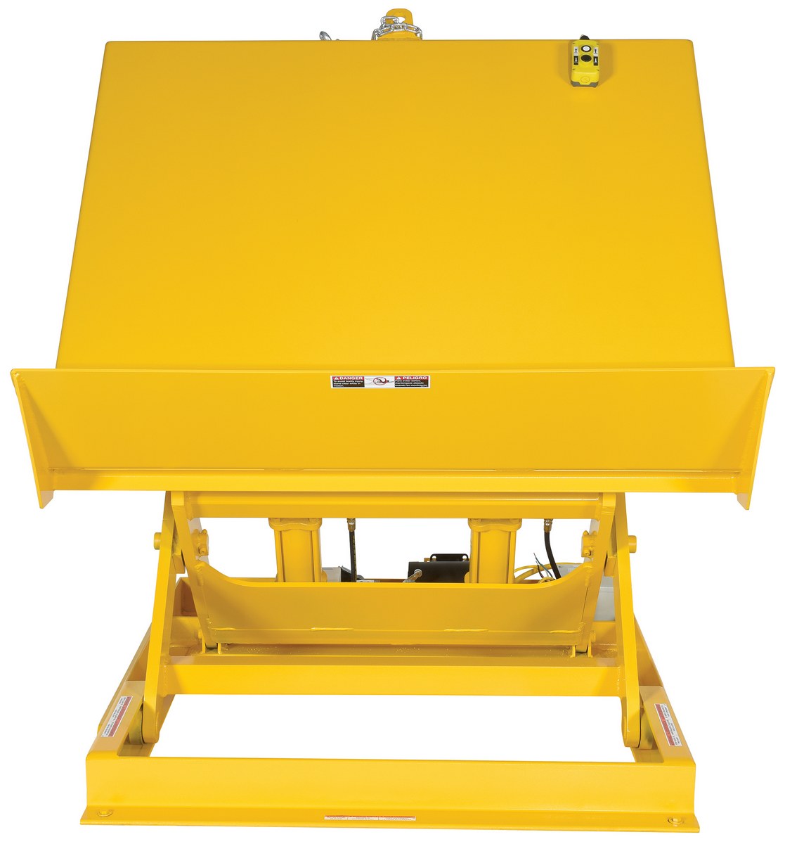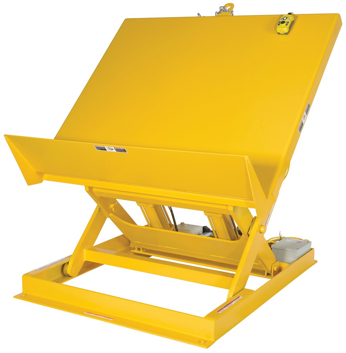 The lift & tilt workstation table allows platform to lift & tilt at the same time for easy operation. The platform end includes a high full width lip to support containers. The internal power unit includes electric motor, hydraulic pump, and control box. It includes a two-button hand held pendent control with optional voltages available. The welded steel construction has a yellow painted finish.