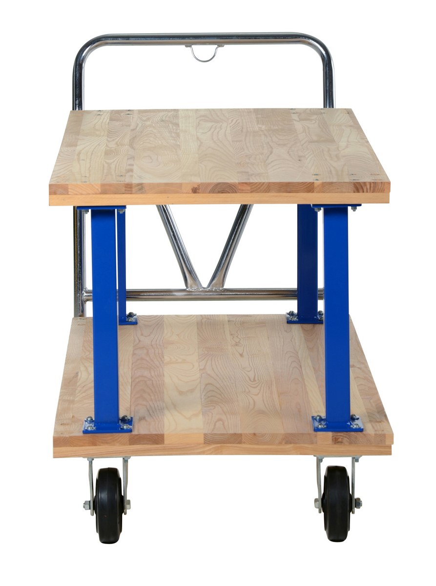 Minimize lifting and bending with this double decker Hardwood platform cart/portable work bench. Ideal for shipping areas, offices, and plant use, these economical carts are perfect for many of your applications. Removable push handle is chrome plated. Countersunk holes allow for a smooth deck surface.