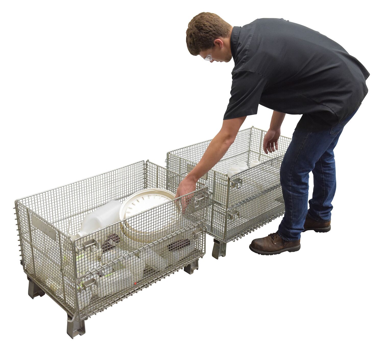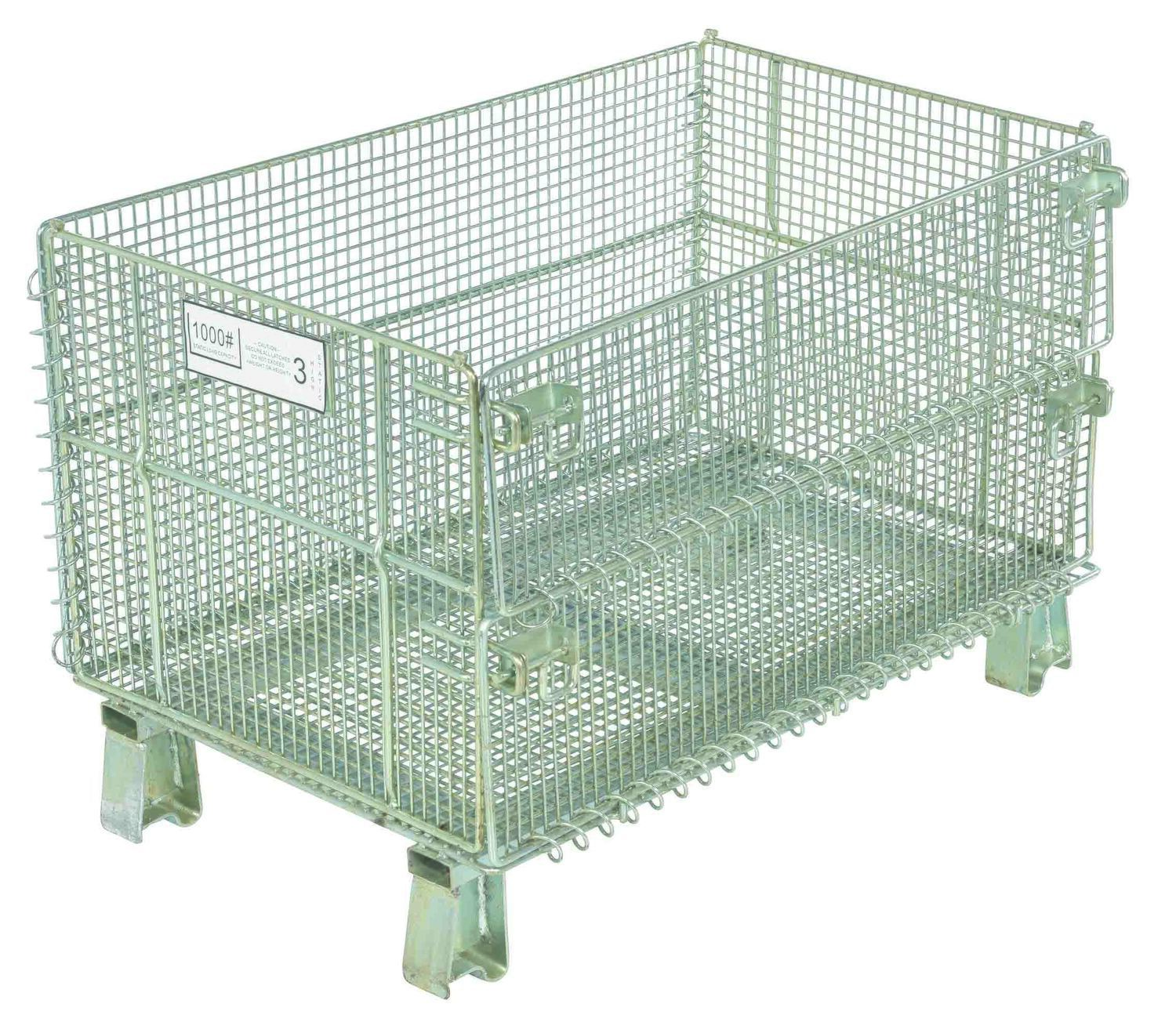 This wire containers allows for efficient storage and transportation. Legs are wrapped and welded around base to eliminate sharp edges. Container can be stacked four (4) high and has clearance underneath to allow movement by fork or pallet trucks.