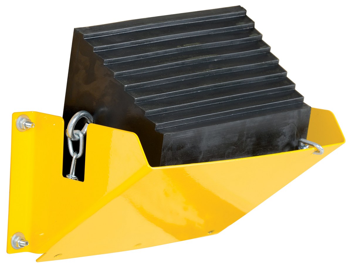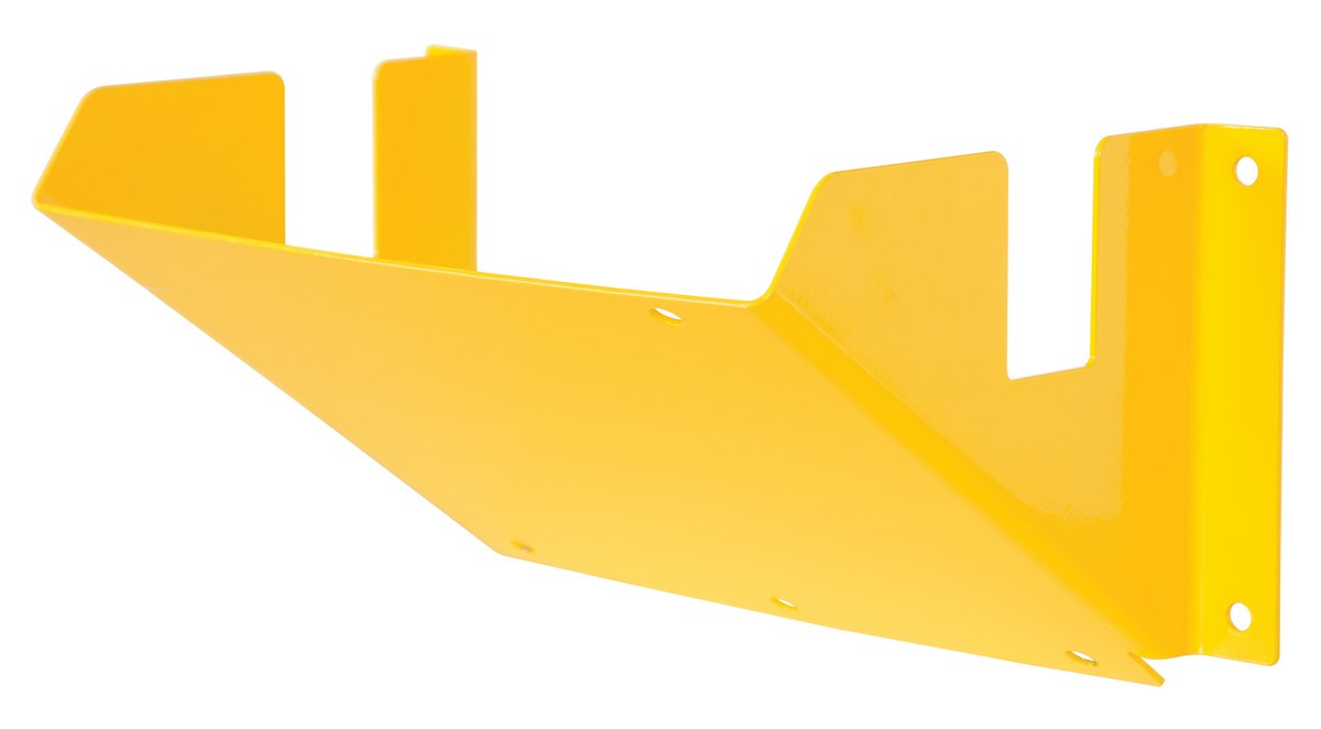 The Wheel Chock holder keeps wheel chocks safe and prepared for use at any moment. The holder features a steel construction for long life and durability, a yellow powder coat finish for visibility, and pre-drilled mounting holes for easy attachment to a designated surface.
