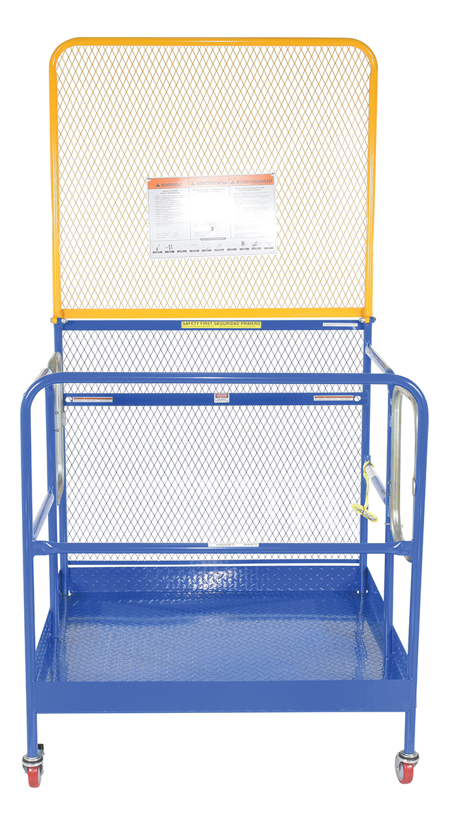 This convenient fork truck work platform quickly and safely raises maintenance personnel where they are needed. Attaches to fork truck by inserting forks into fork pockets and securing platform to fork truck. Fork locks secure platform to forks. Expanded metal backing on fourth side. Includes checker floor plate platform and long strap with hook to attach platform to fork truck. A maximum of two (2) people can be in the work platform at one time. Meets California OSHA specifications.
