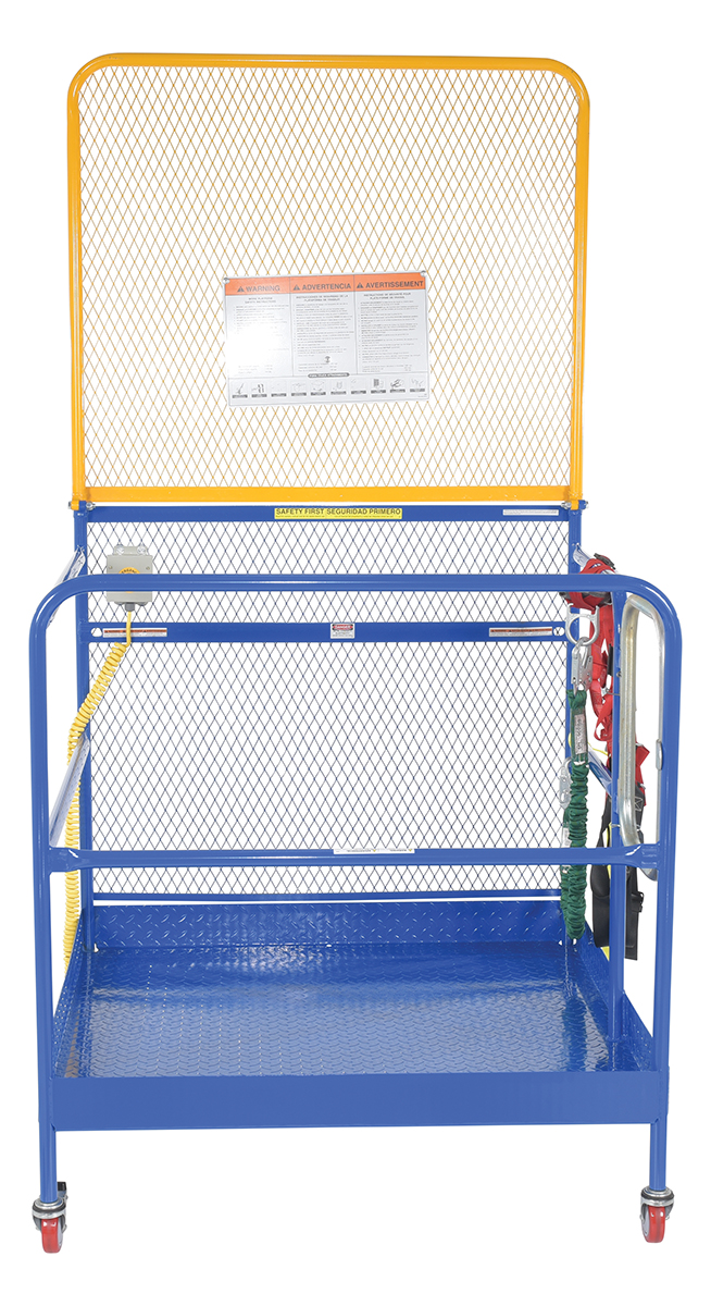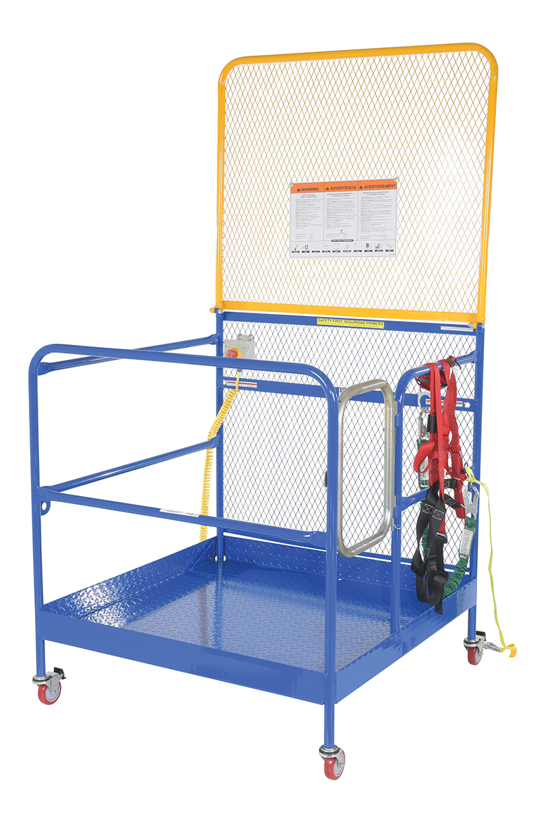 This convenient fork truck work platform quickly and safely raises maintenance personnel where they are needed. Attaches to fork truck by inserting forks into fork pockets and securing platform to fork truck. Fork locks secure platform to forks. Dual handrails on three (3) sides with expanded metal backing on the fourth side. Includes checker floor plate platform and long strap with hook to attach platform to fork truck. A maximum of two (2) people can be in the work platform at one time. The full featured units include an emergency stop button kit and web lanyard with XL safety harness. Alternate size harnesses available upon request, S-XL (XXL & XXXL available at an additional charge).