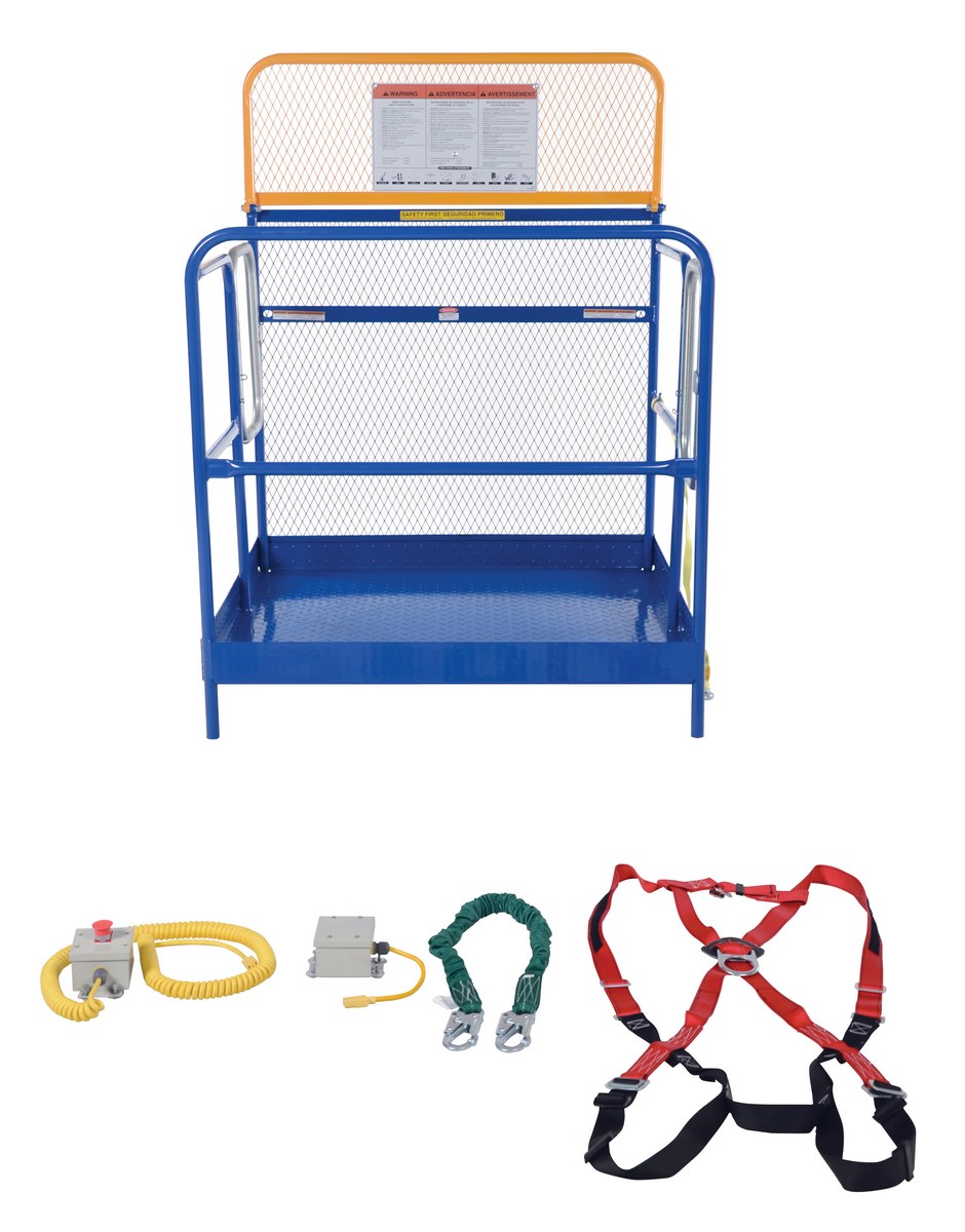 This convenient fork truck work platform quickly and safely raises maintenance personnel where they are needed. Attaches to fork truck by inserting forks into fork pockets and securing platform to fork truck. Fork locks secure platform to forks. Dual handrails on three (3) sides with expanded metal backing on the fourth side. Includes checker floor plate platform and long strap with hook to attach platform to fork truck. A maximum of two (2) people can be in the work platform at one time. The full featured units include an emergency stop button kit and web lanyard with XL safety harness. Alternate size harnesses available upon request, S-XL (XXL & XXXL available at an additional charge).