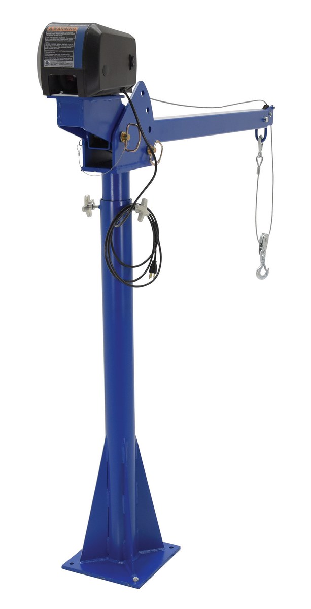 Steel AC Powered Jib Crane CSA Compliant 4-7 Ft. Boom 2,000 Lb. Capacity BlueA power lift Jib crane is designed for material handling applications on docks, in warehouses or in truck beds. This intermittent unit uses crane feature rotation hand brakes that offer unlimited positioning. The mast mounts permanently. Boom adjusts in one (1) foot increments and can be positioned at four (4) elevations. Fingertip switch to raise and lower hook. Folds for storage. Unit is designed for vertical lifting only. Do not use unit for lifting personnel or overhead lifting.