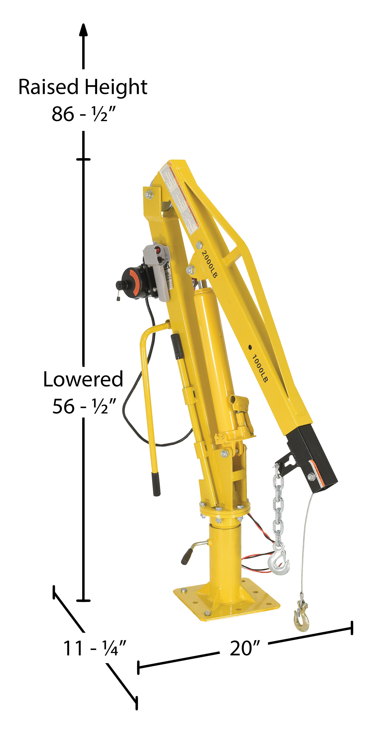 Steel DC Powered Winch Truck Jib Crane 44 In. Reach 1,000 Lb. Extended Capacity YellowInstalled in your pick-up truck bed, this winch operated jib crane will help lift loads. Lift items from ground to truck bed height, then rotate into cargo area. Includes telescopic boom design with manual hydraulic hand pump to pivot boom up and down. DC powered cable winch to lift and lower loads. Unit comes with one fixed hook, one chain slot lock, and one cable hook with latch.