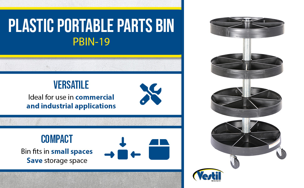 Cut parts picking time in half with these space saving, rotating Parts Bins. Compact enough to fit in small spaces such as corners and ends of aisles. Great for organization of small parts. Ideal for use in commercial and industrial applications. Rugged molded plastic construction with four swivel casters for portability. Each shelf is 2-1/8" deep. The space between the shelves is 8".