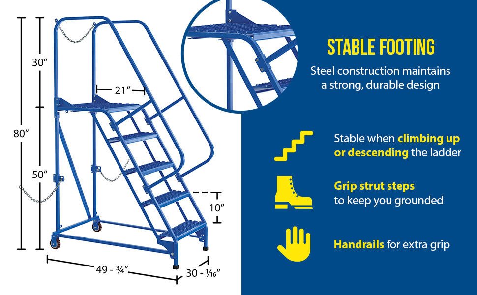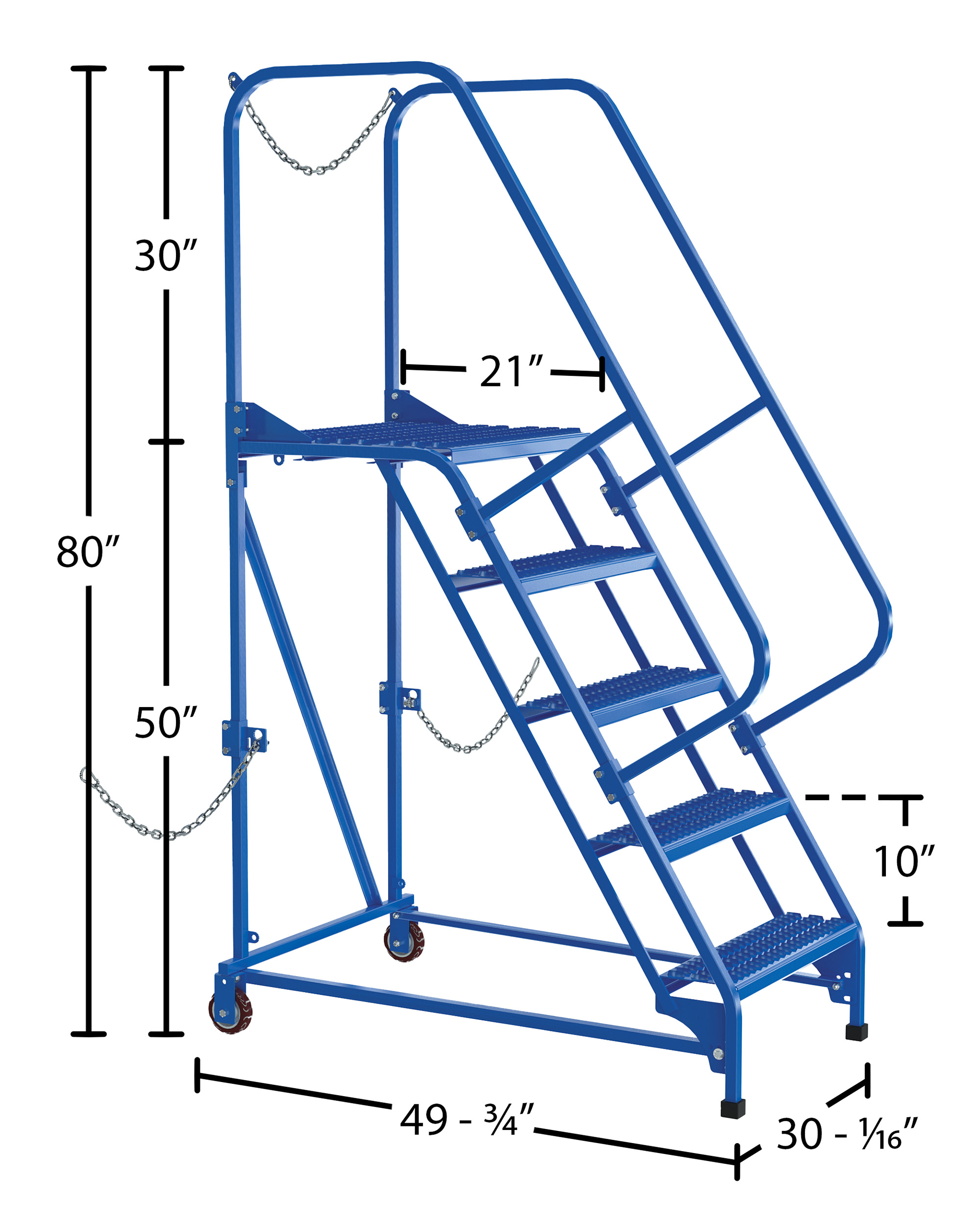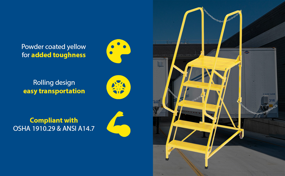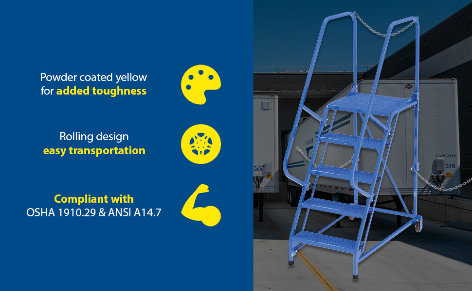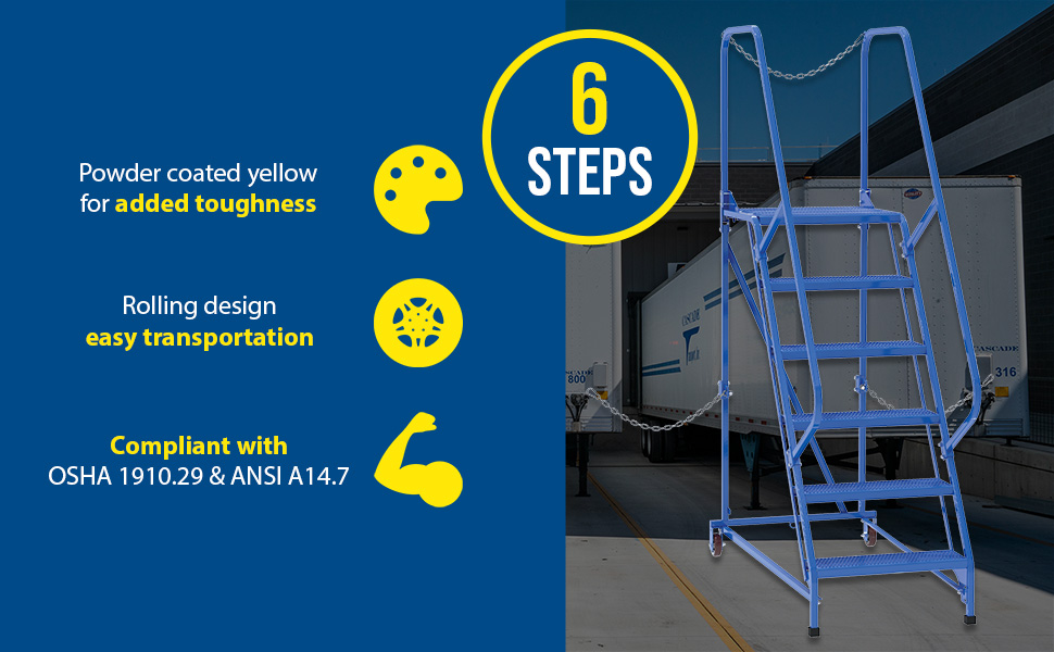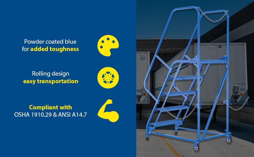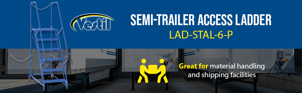 Semi-Trailer Access Ladders are for use getting into Semi-Trailers. Tilt the unit to allow for portability. Units roll on 4" poly-on-poly wheels. Constructed of square tubing framework which handles uniform capacities up to 350 lbs. Features 30" high removable hand railing, access chain, 21" deep top platform, and an industrial baked-in blue powder coat finish for toughness. Each step measures 24" wide by 7" deep and is spaced 10" apart. Climb Angle is 58 degrees.