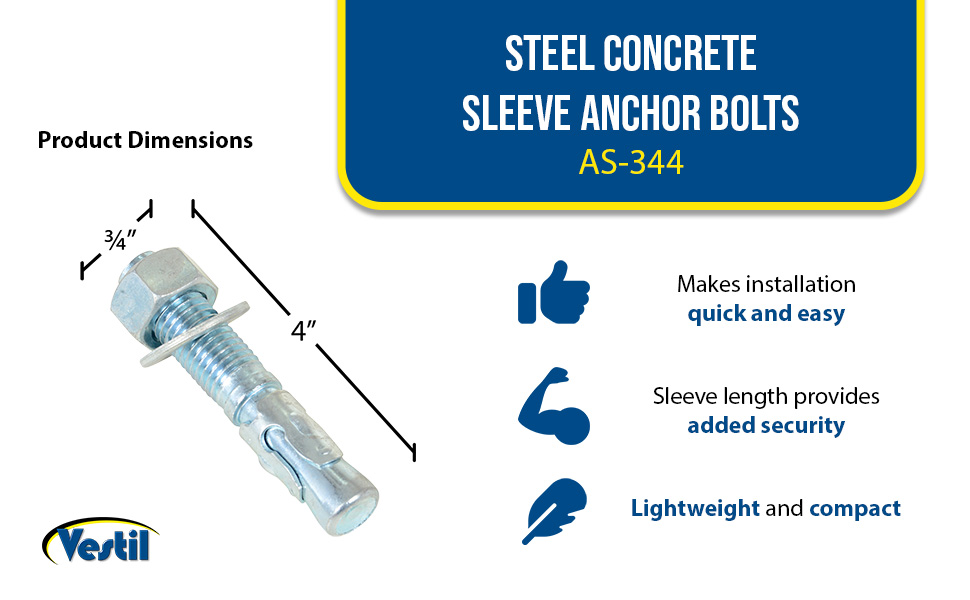 AS-344-12PK AS-344-12PKSteel Concrete Sleeve Anchor Bolts 12 Pack 3/4 In. x 4 In. SilverPackage (qty.): 12